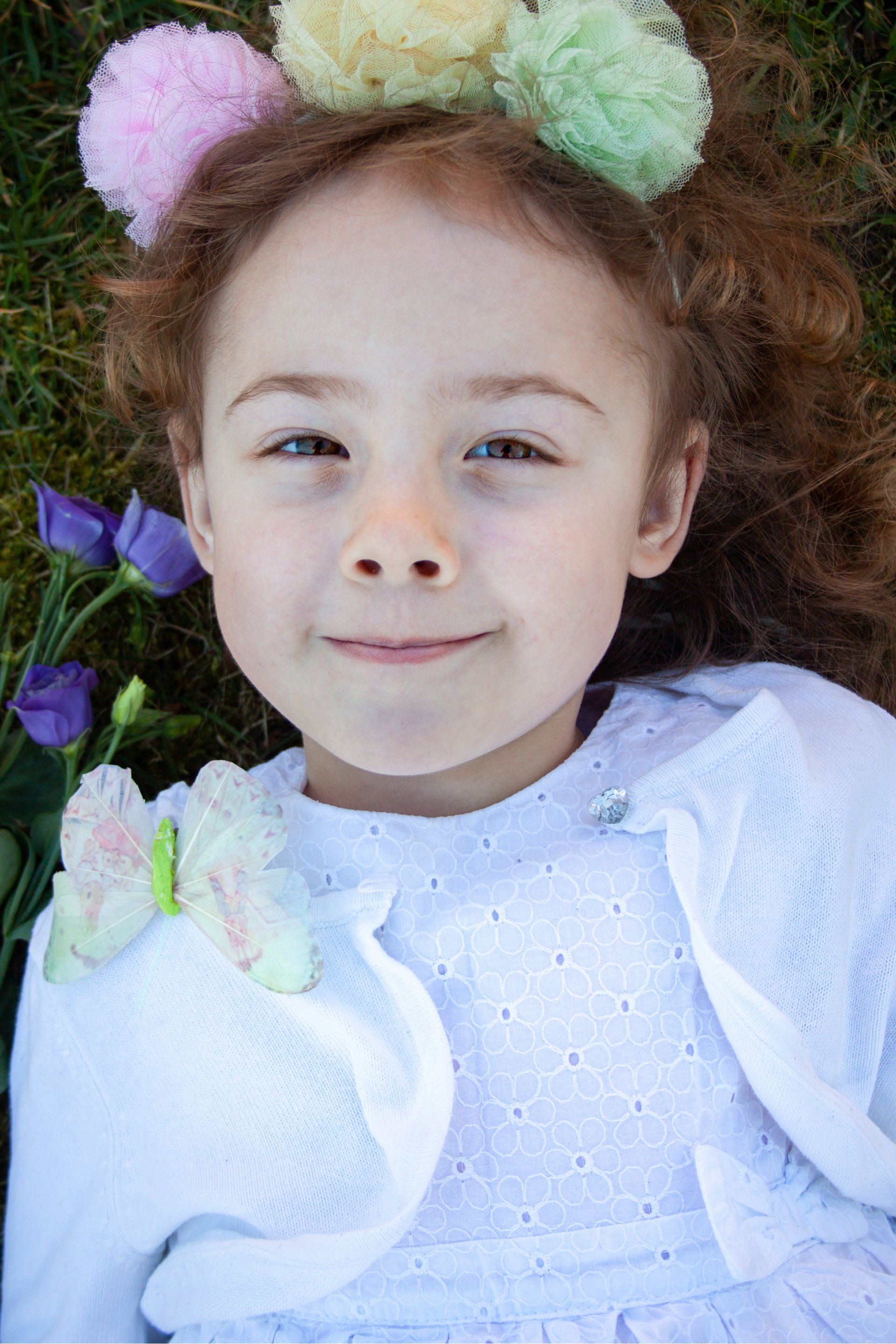 De foto rechts heb ik gemaakt op een half bewolkte dag, perfect weer om foto's met zacht licht te maken. Ik heb het meisje in een witte jurk met bloemen gekleed om hiermee puurheid en onschuld uit te beelden. Om het beeld op te vrolijke en het kinderlijke karakter te versterken heb ik er voor gekozen om een haarband met pastelkleurige pompons om te doen. Daarbij draagt ze een vlinder in dezelfde kleuren. De vlinder staat voor transformatie van een baby naar een kind. Een baby is haarloos, kan nog niet praten en zichzelf uiten. Maar een kind heeft een eigen mening en kan zichzelf veel beter uiten en eigen karaktereigenschappen vormen. Door gebruik te maken van zacht licht wordt de puurheid van het kind versterkt. Het vrij blanke huidje lijkt egaler en zachter dan bij gebruik van hard licht. Doordat het meisje een beetje lacht zowel met haar mond, als met haar ogen lijkt ze tevreden en een beetje verlegen.