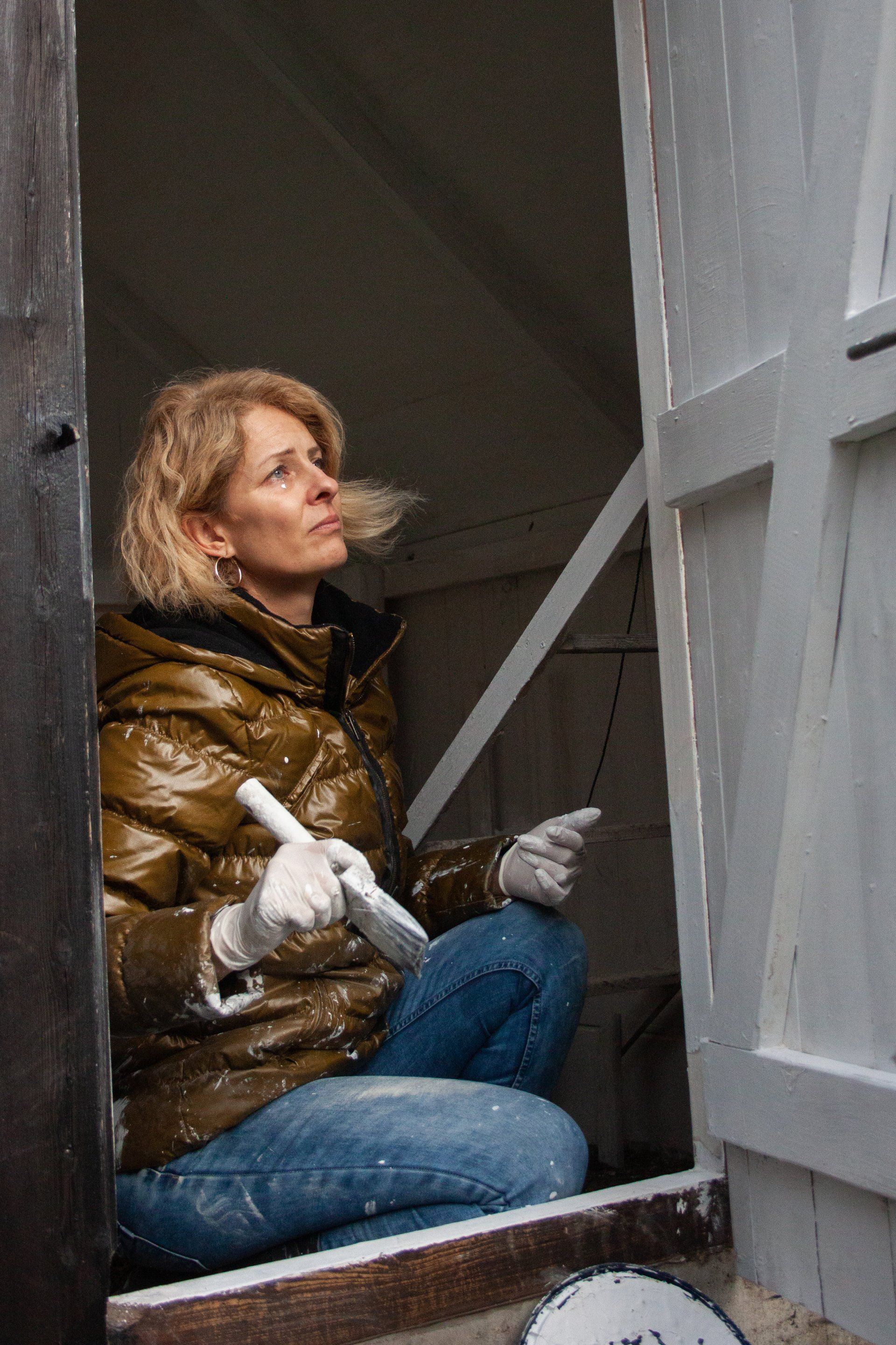 Deze foto heb ik ook op een licht bewolkte dag gemaakt, om hiermee zacht licht toe te kunnen passen. Dit was een lastige uitdaging, aangezien de persoon op de foto binnen in een kippenhok zat. Door de deur half open te doen kon er genoeg licht op de vrouw vallen. Het licht valt goed op haar gezicht en legt nadruk op haar jukbeenderen, om hiermee de vrouwelijkheid te versterken. Door gebruik van zacht licht en doordat de persoon in de deuropening zit, is de achtergrond niet belicht maar de persoon en witte deur wel. Dit is ook waar de voorstelling over gaat. Op de foto is een vrouw te zien die de deur wit aan het schilderen is. Ze kijkt verdrietig en emotioneel naar de geverfde deur, alsof ze er een emotionele waarde aan hecht. Onder haar oog is een witte verfvlekje te zien, die een traantje moet voorstellen. Hierdoor wordt er extra nadruk op gelegd dat ze verdrietig is en wat ze ziet haar emotioneel maakt. Het is namelijk een oude kippenhok die haar overledene man heeft gebouwd, deze is ze nu aan het opknappen.