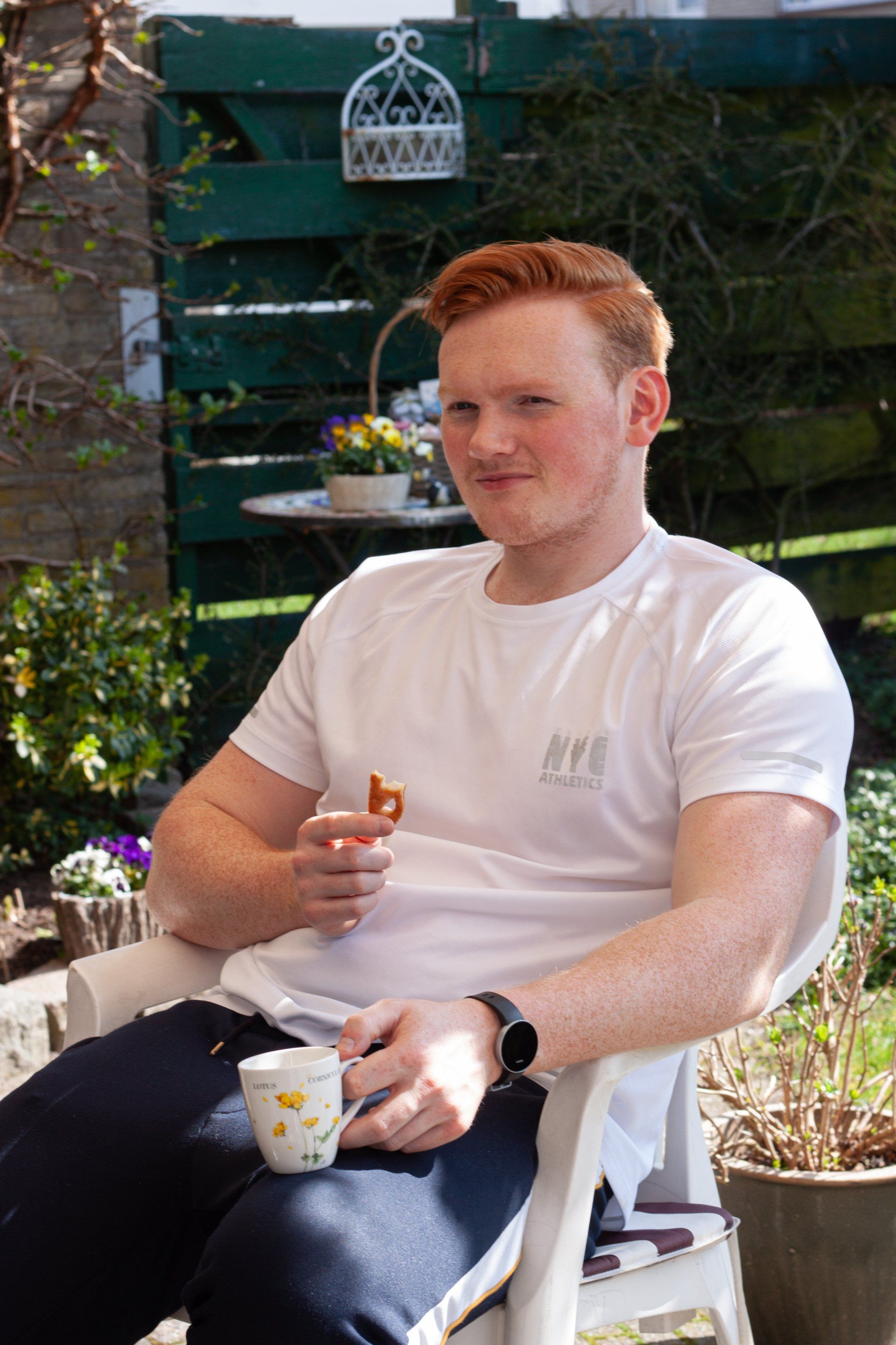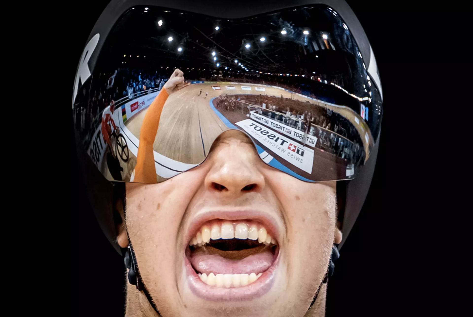 Bij deze foto is gebruik gemaakt symmetrie, waarbij we als kijker centraal op het gezicht bekijken van Harrie. Daarbij is de foto recht van voren geschoten, ook komt het licht van voren. Toch ontstaan er veel dynamiek in de foto door de bril, waarin we als toeschouwer kunnen ervaren en zien wat Harrie op dat moment ook voor zich ziet. We stappen als ware in de schoenen, of ook wel in de 'helm' van Harrie. We zien verder de persoon niet, alleen zijn mond en neus maar toch is dit genoeg om de emoties te voelen doordat we ook mee kunnen kijken in de bril. Er is een duidelijk contrast doordat de achtergrond zwart is, maar het gezicht van Harrie wel vol in het licht staan. De invalshoek is: de emoties tijdens de overwinning van een baanwielrennen wedstrijd.