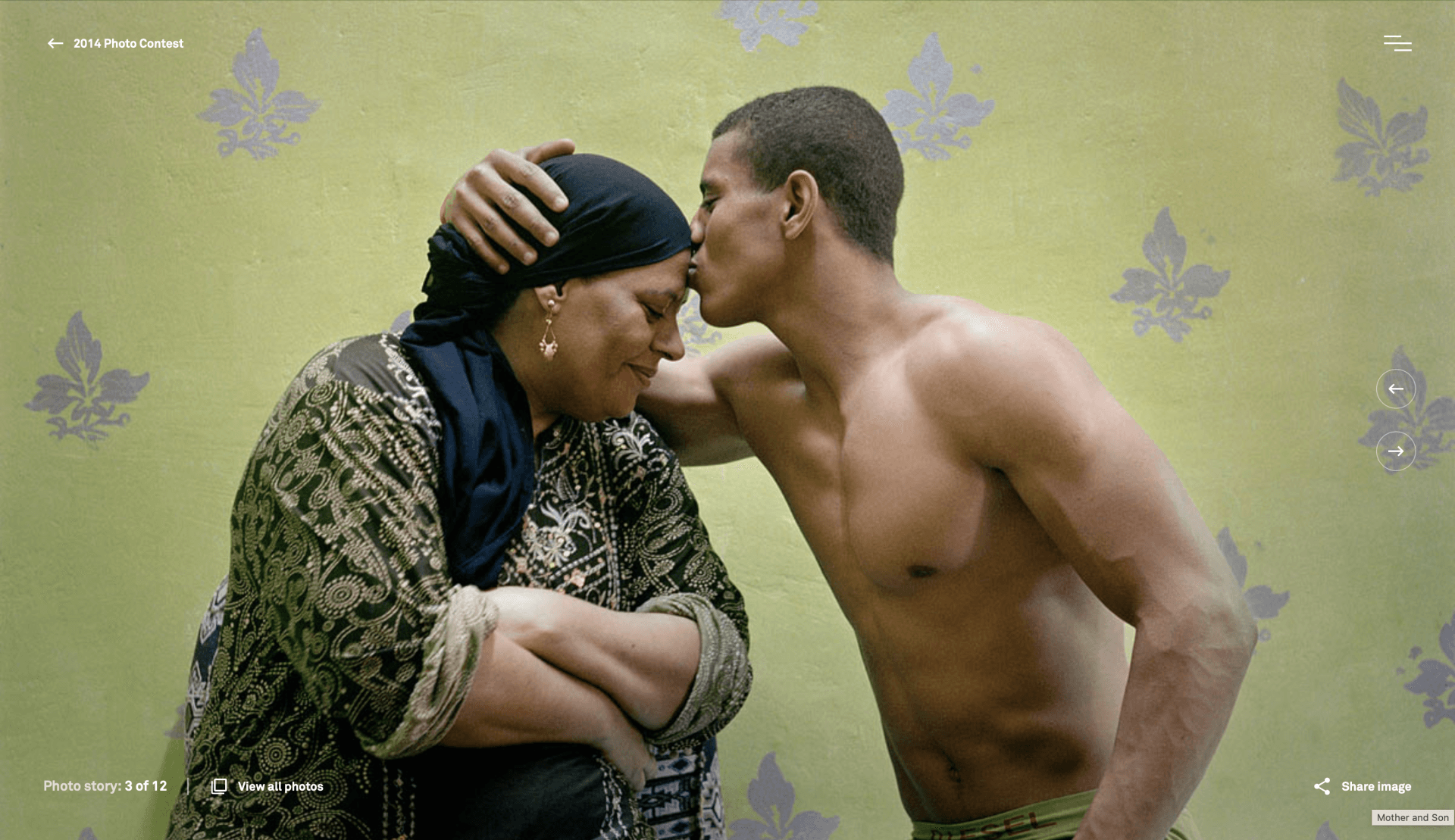 Bij deze foto is gebruik gemaakt van een gesloten kader en symmetrie, hierdoor kan de kijker zijn volledige aandacht op de twee personen in het midden richten. Hiermee kun je zeggen dat de moeder en zoon belangrijkste rol spelen. Ook kun je zeggen dat ze gelijk aan elkaar zijn. Er is gebruik gemaakt van zacht licht, met als gevolg dat alle elementen op de foto gelijkmatig aandacht krijgen. Op de achtergrond zien we een gele muur met paarse motieven, dit zijn kleuren die tegenover elkaar staan in de kleurencirkel en hiermee ook een contrast vormen. Dit kan een nadruk geven van het contrast en verschillen tussen moeder en zoon. De invalshoek van de fotograaf is trots en liefde tussen moeder en zoon.