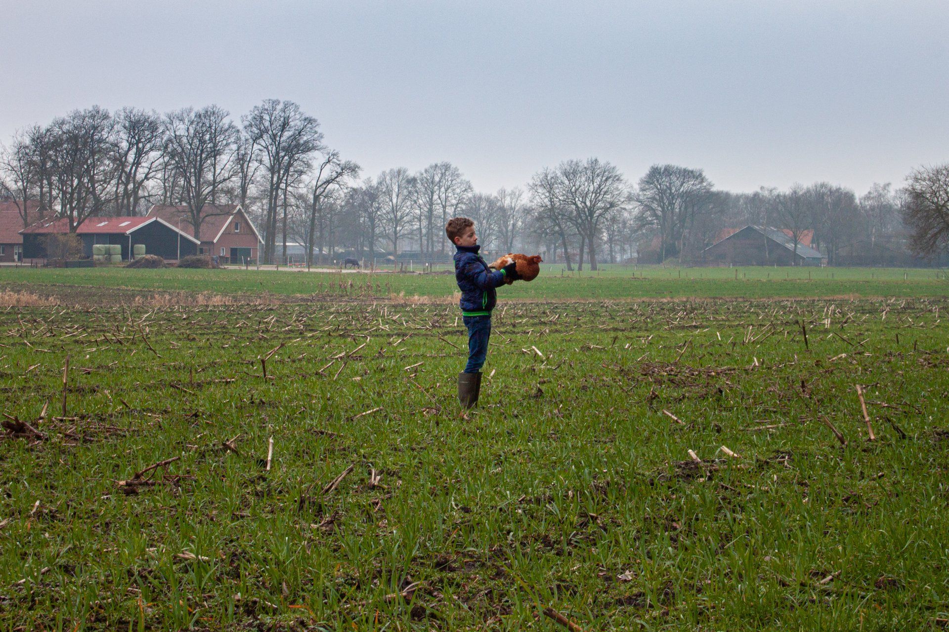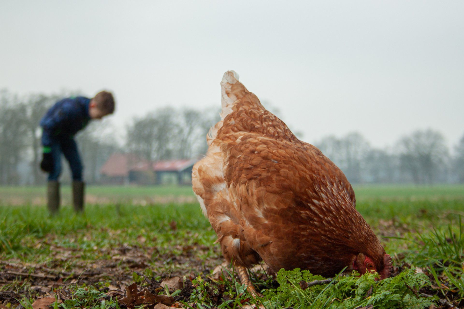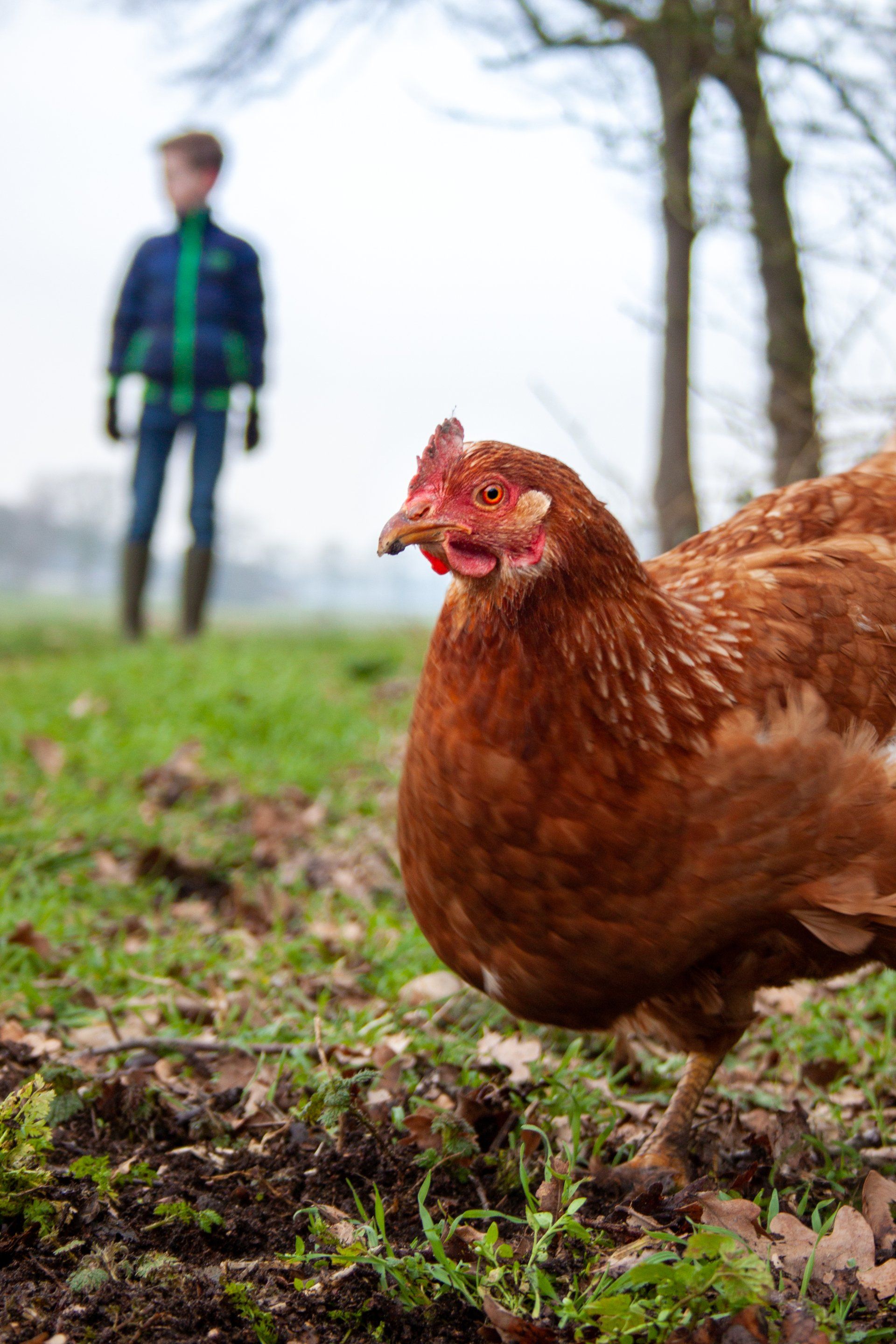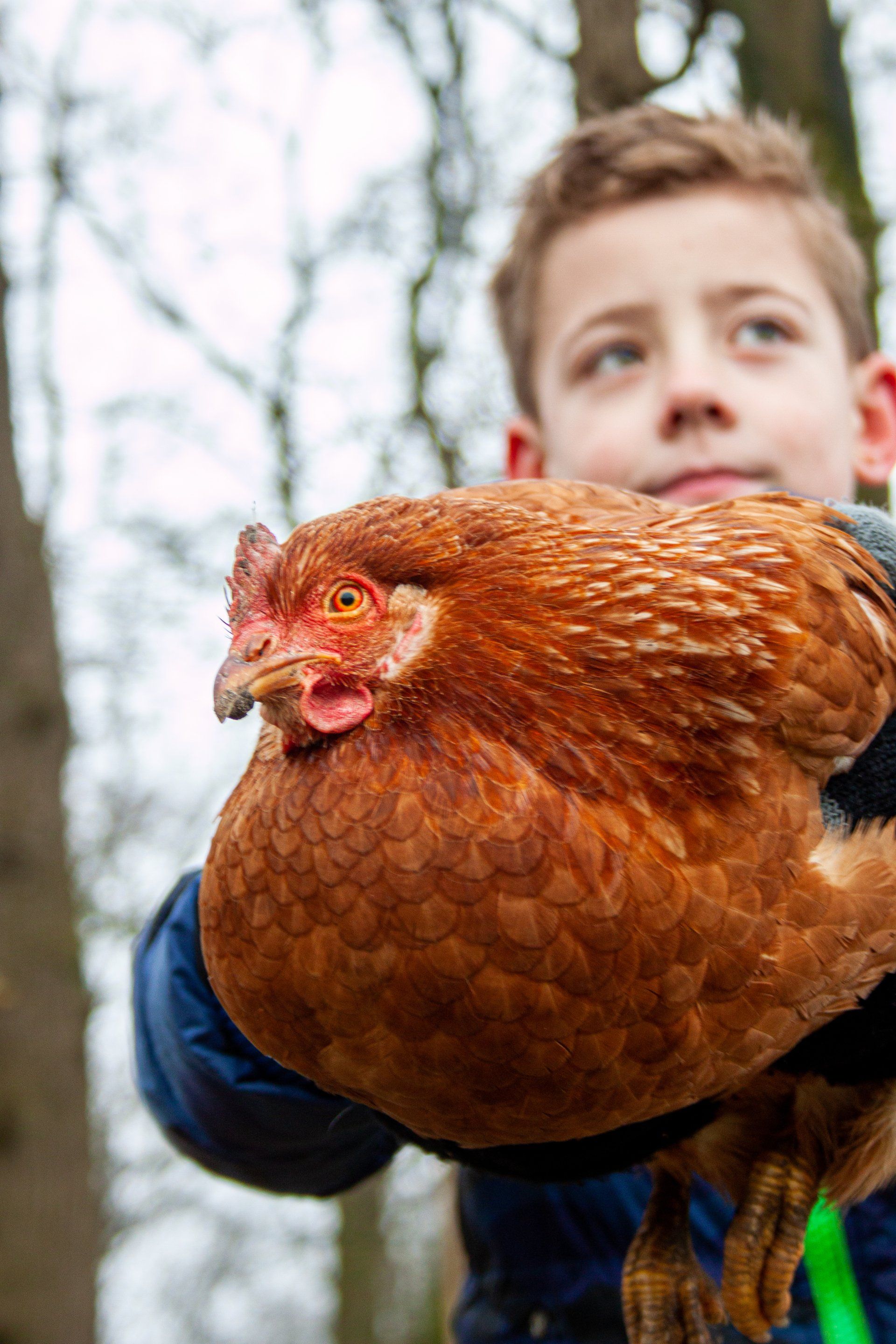 Bij het maken van deze foto heb ik gebruik gemaakt van een grote diafragma. Hierdoor is de kip een hoofdrolspeelster en het jongetje heeft een bijrol op de achtergrond. De kip is scherp afgebeeld waarbij je alle details kan zien en bijna het textuur van de veren kan voelen. Daarbij zijn de foto's geschoten vanuit het perspectief van een kip om de kijkers het gevoel te kunnen geven alsof ze de kip bijna kunnen aanraken en voelen. De jongetje op de achtergrond maakt dezelfde bewegingen als de kip, hierdoor kun je een duidelijke band en overeenkomst zien tussen de twee wezens. Hierdoor wil ik de nadruk er op leggen dat een dier vergeleken kan worden met een mens en dat de twee vriendschap kunnen vormen.