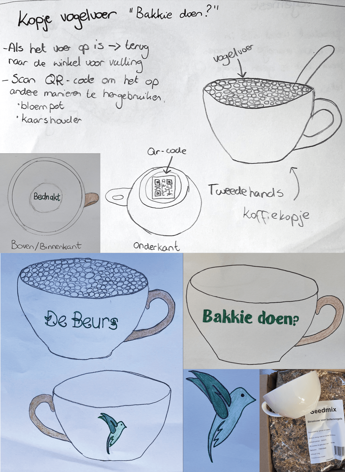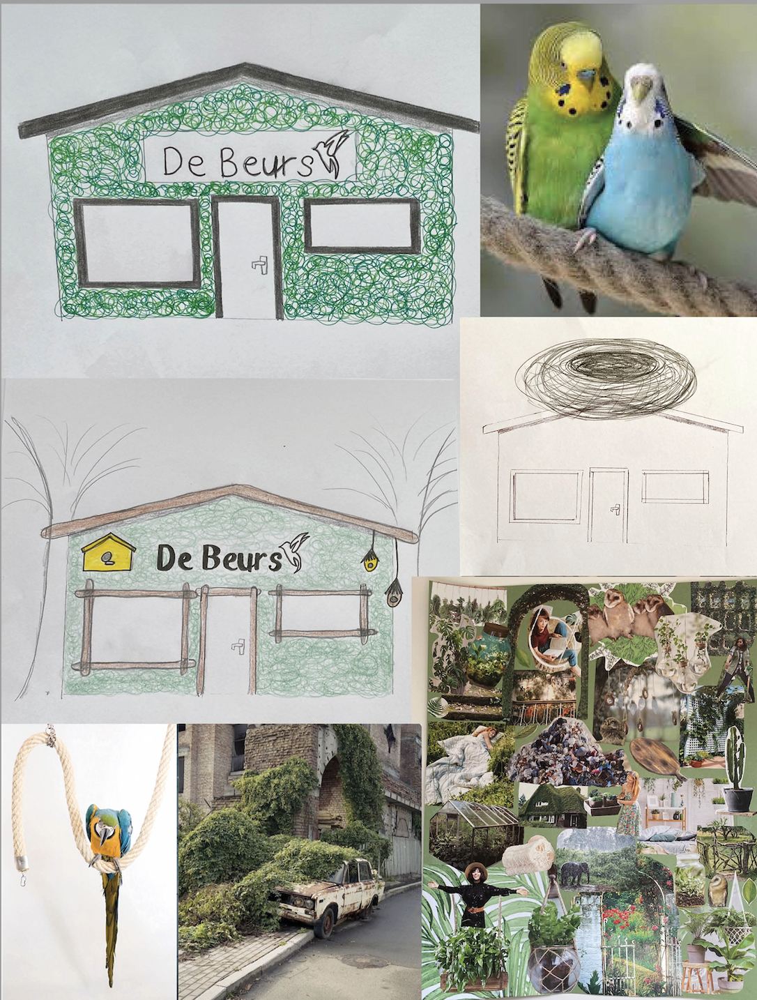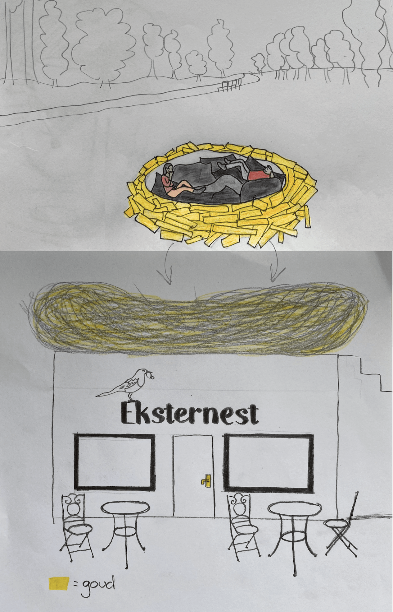 Toen ik het idee van groene duurzaamheid heb weggegooid, kwam ik op heel veel nieuwe ideeën. Ik werd helemaal enthousiast en heb het totaal omgegooid en eksternest van gemaakt. Waarbij er letterlijk een gouden nest op het dak zit waar je als klant in kan gaan zitten. Daarbij heeft het oude gebouw van de beurs alleen een klein bankje om te zitten. Binnen kun je koffie halen uit een automaat en deze voor de winkel opdrinken. Maar doordat er bijna geen zitruimte is, halen weinig klanten daar de koffie. Daarom heb ik bedacht om buiten tafeltjes en stoelen te plaatsen, om na of tijdens het winkelen buiten even koffie te gaan drinken. Dit sluit ook aan mijn product: koffiekopje met vogelvoer.
