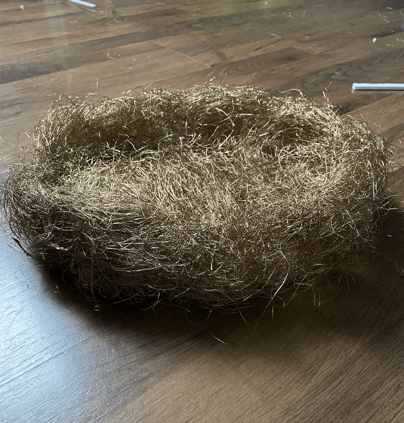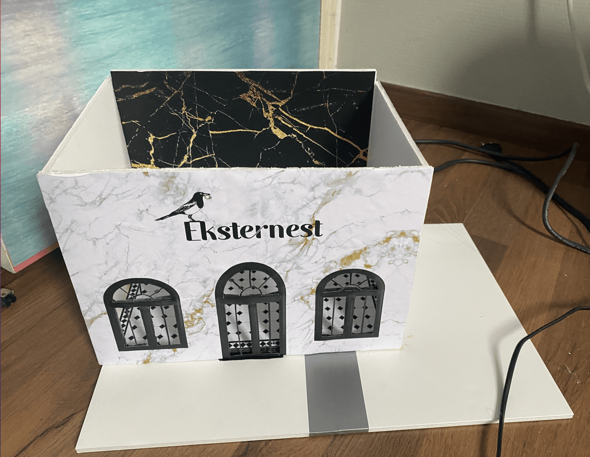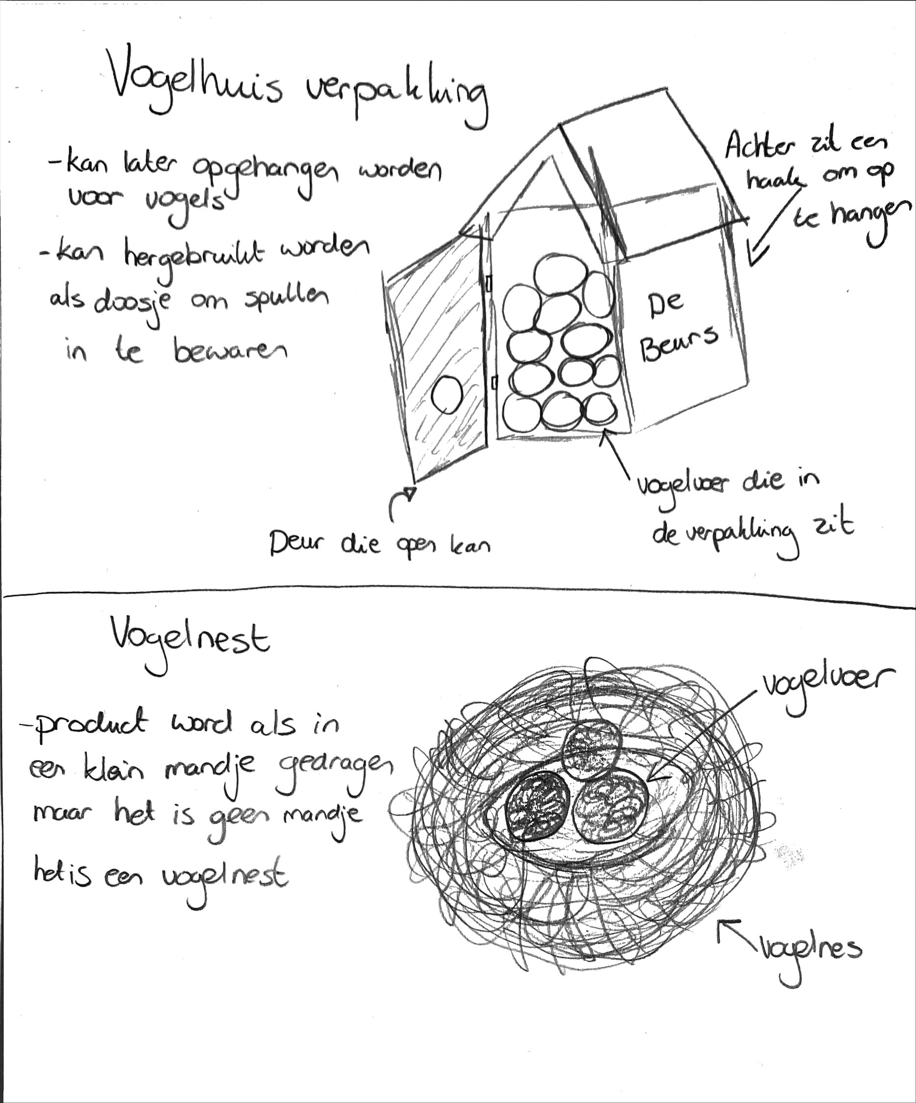 Toen ik het idee van groene duurzaamheid heb weggegooid, kwam ik op heel veel nieuwe ideeën. Ik werd helemaal enthousiast en heb het totaal omgegooid en eksternest van gemaakt. Waarbij er letterlijk een gouden nest op het dak zit waar je als klant in kan gaan zitten. Daarbij heeft het oude gebouw van de beurs alleen een klein bankje om te zitten. Binnen kun je koffie halen uit een automaat en deze voor de winkel opdrinken. Maar doordat er bijna geen zitruimte is, halen weinig klanten daar de koffie. Daarom heb ik bedacht om buiten tafeltjes en stoelen te plaatsen, om na of tijdens het winkelen buiten even koffie te gaan drinken. Dit sluit ook aan mijn product: koffiekopje met vogelvoer.