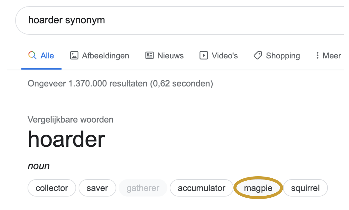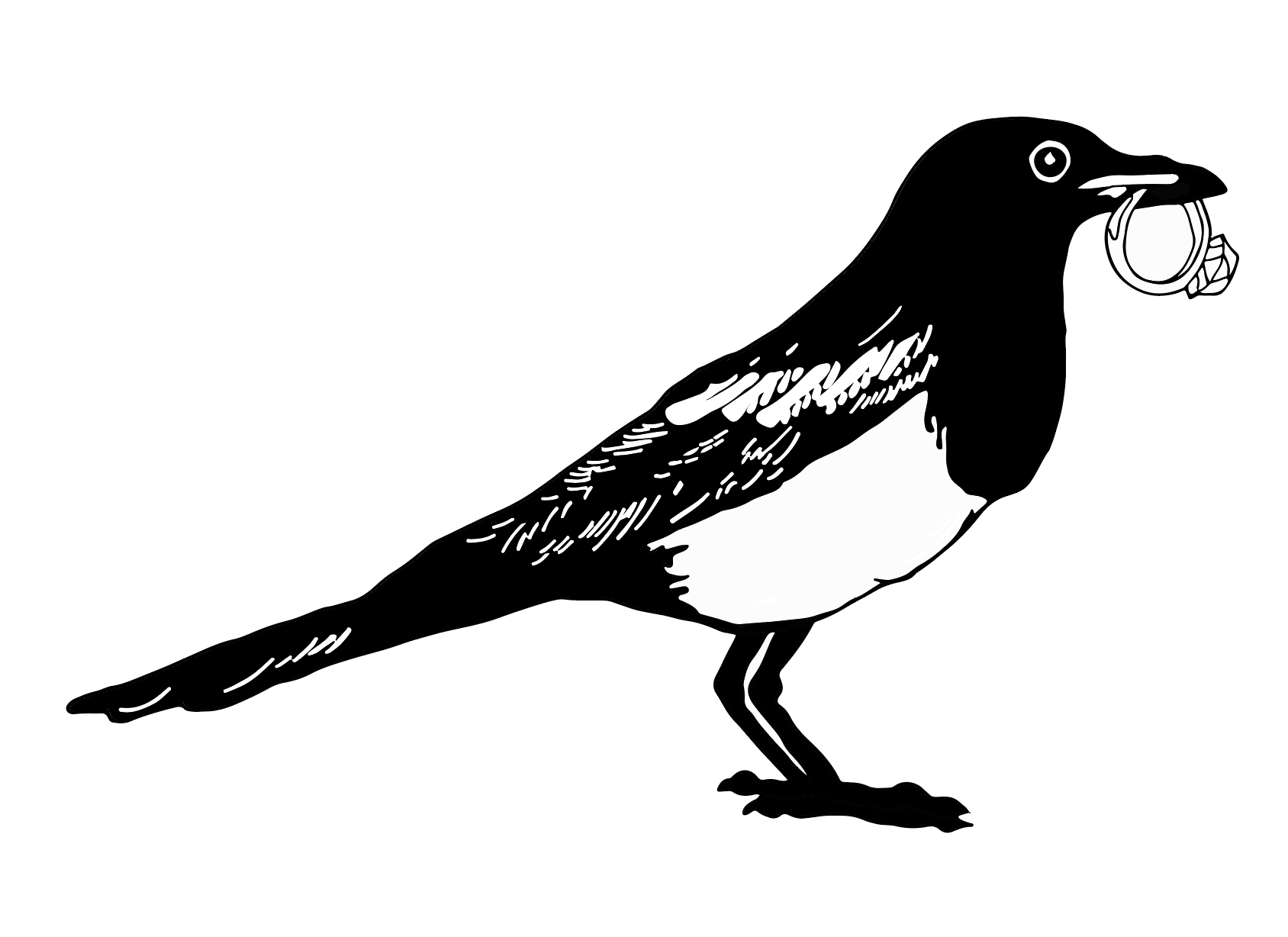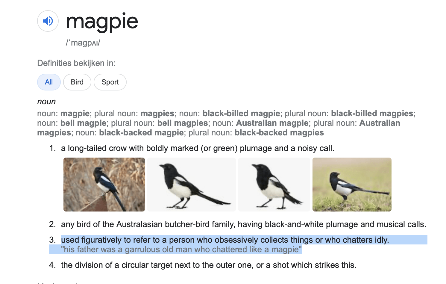 Vergelijking: mensen vergelijken met eksters. Ekster verzameld glimmende/gouden spullen, een vrij 'hebberig dier'. Net als de klanten die in de winkel komen voor tweedehands spullen.