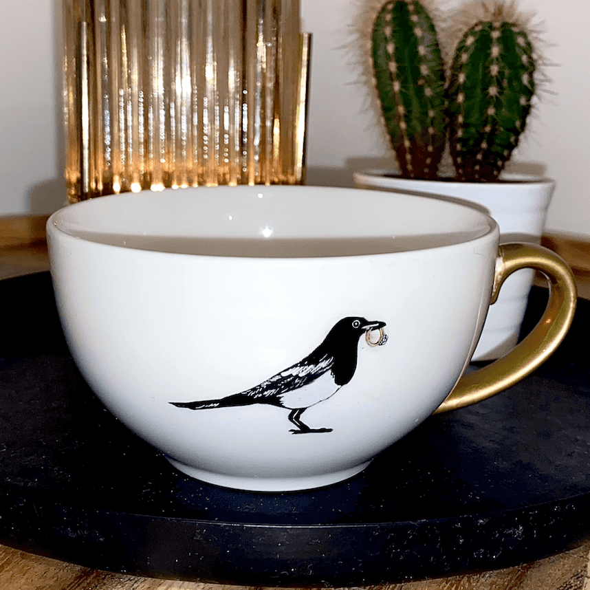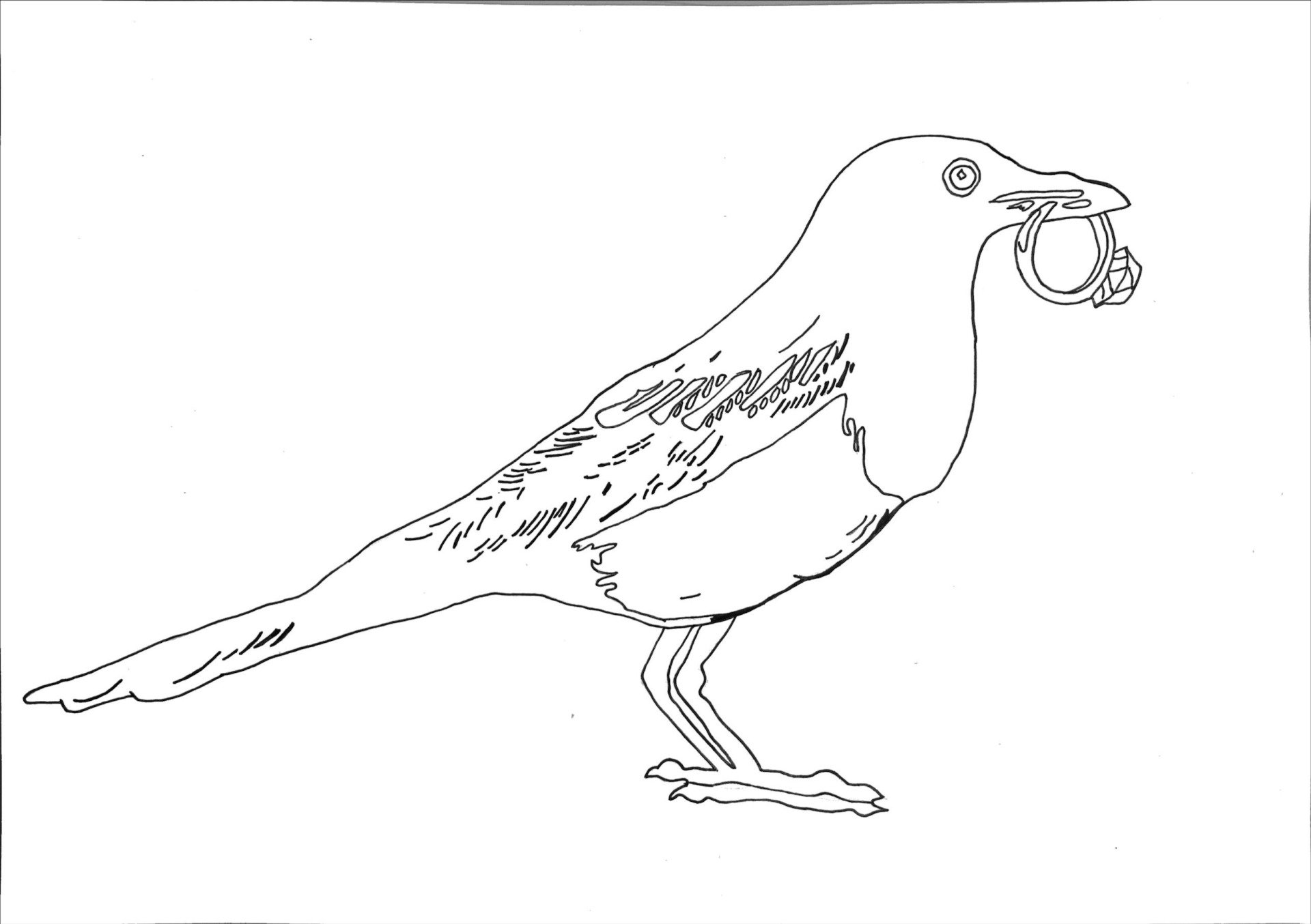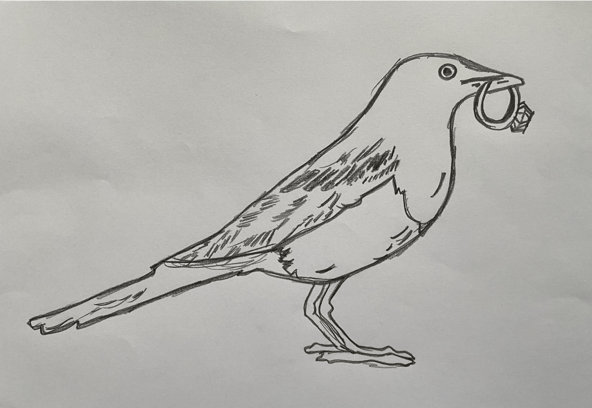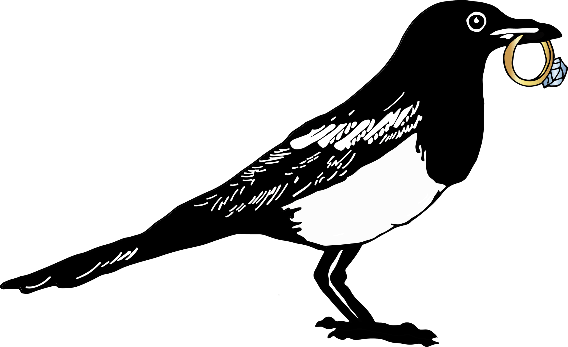 Vergelijking: mensen vergelijken met eksters. Ekster verzameld glimmende/gouden spullen, een vrij 'hebberig dier'. Net als de klanten die in de winkel komen voor tweedehands spullen.