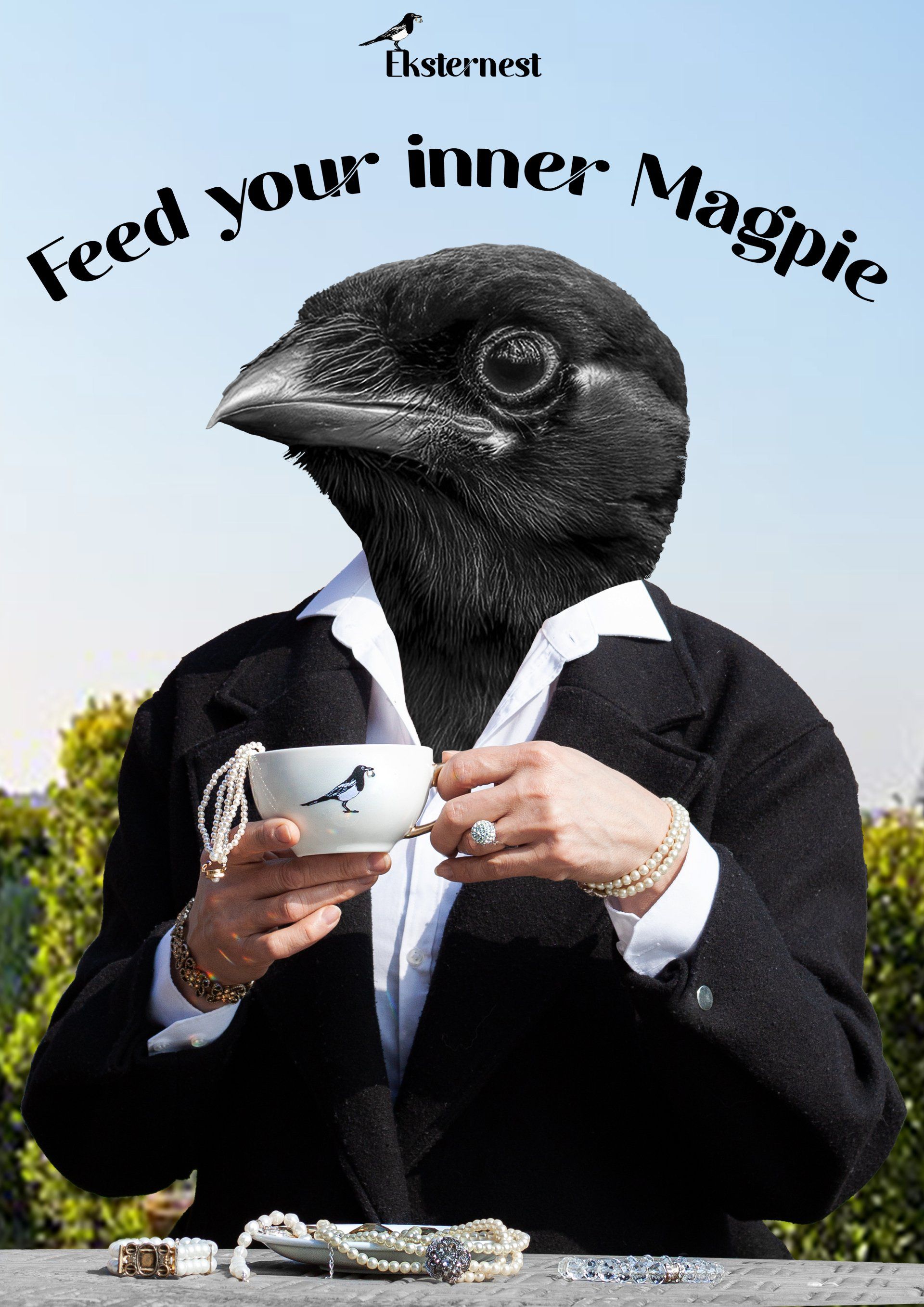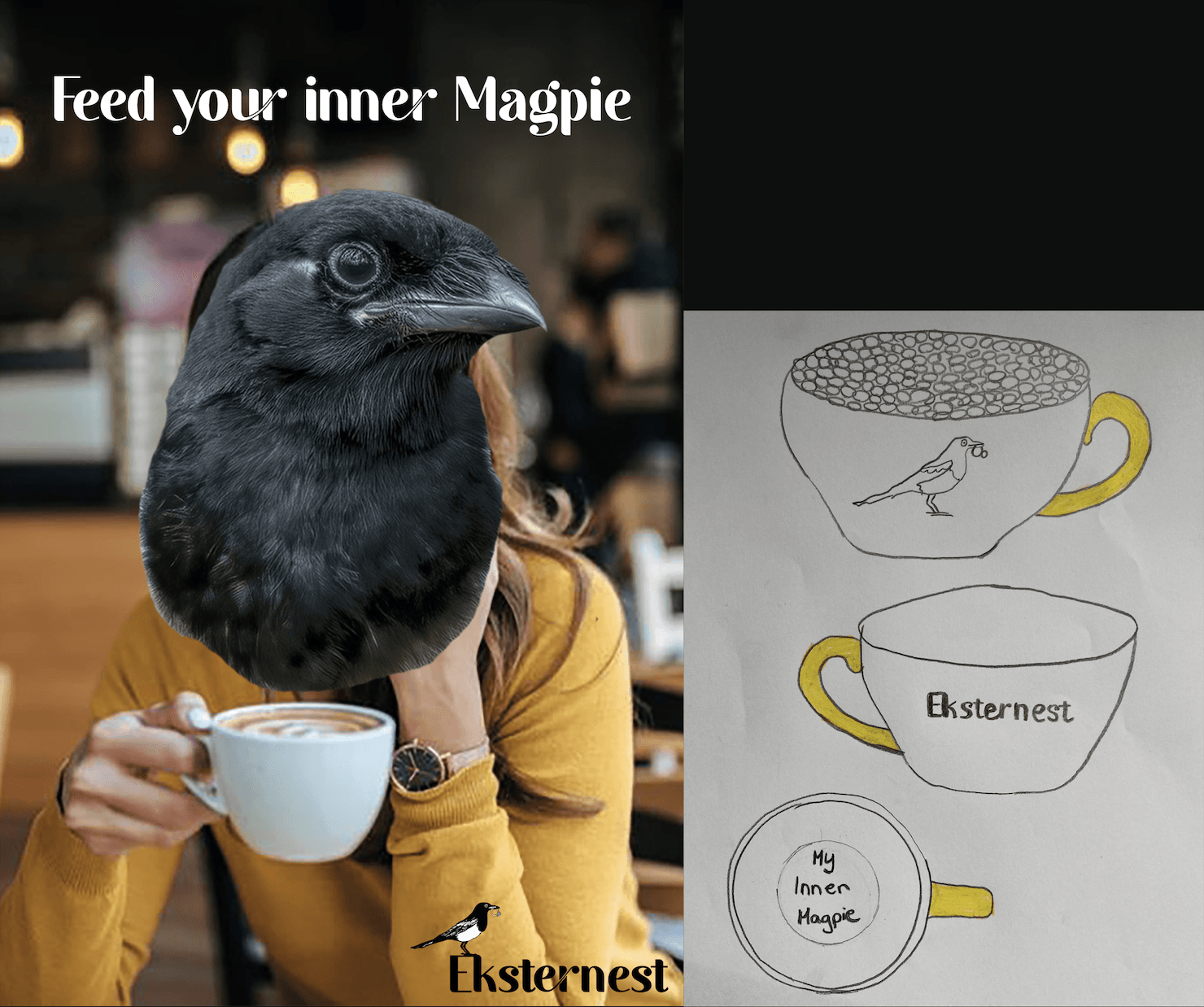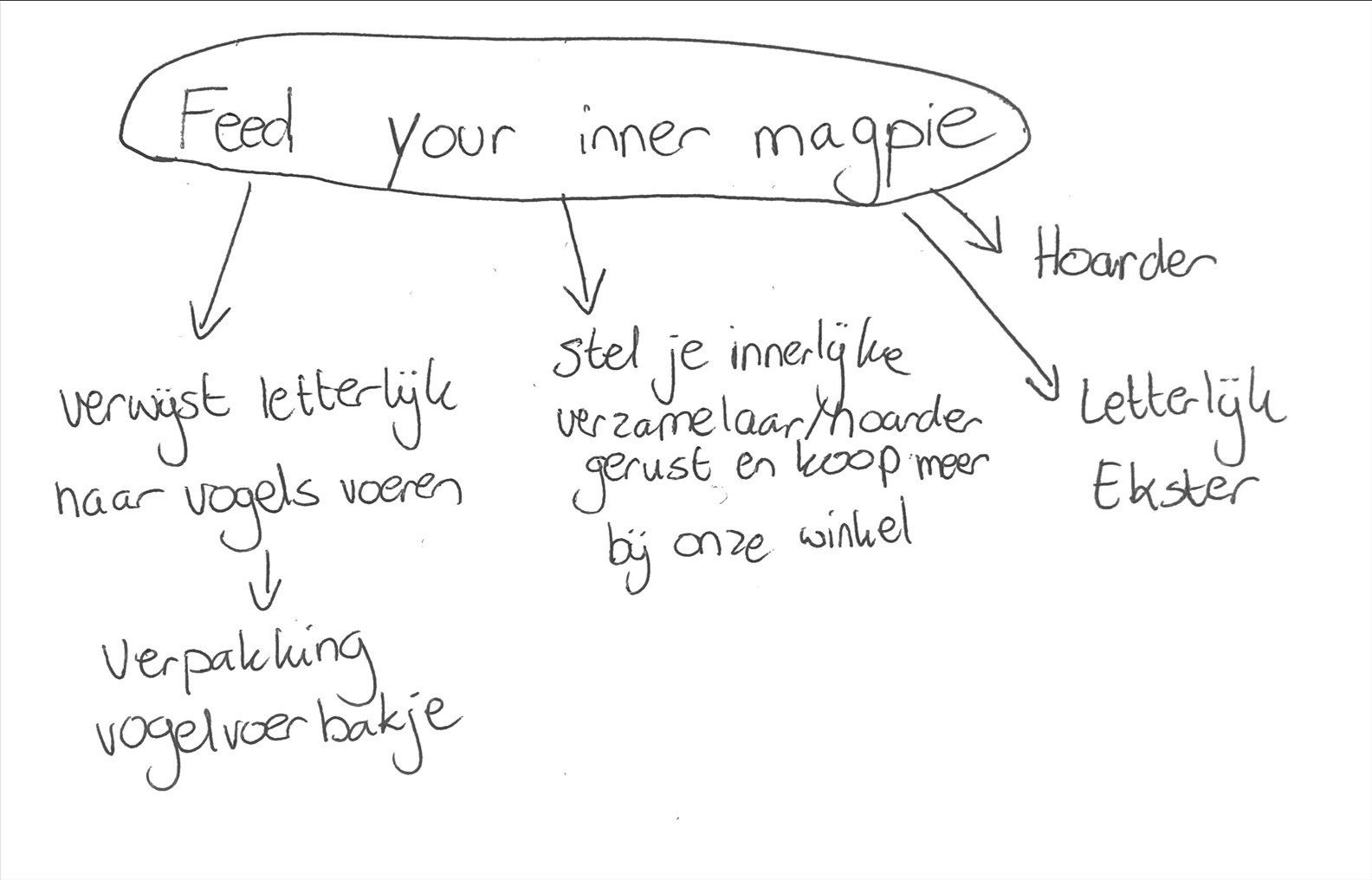 Daarna heb ik het beter toegepast op de stijl van het eksternest door een ekster als hoofd op de mens te gebruiken. Ook heb ik besloten om het kopje die je als verpakking kan kopen in mijn poster te verwerken. Ik heb de tekst 'Feed your inner Magpie' bedacht op basis van 'feed your inner child'. De tekst legt letterlijk een link naar het voeren van een ekster en dus ook het product van een vogelvoer bakje. Daarbij is Magpie in het engels een synoniem voor hoarder, dus een persoon die veel spullen verzameld. Hiermee wil ik overdrijving en bespotten gebruiken om letterlijk te zeggen dat je in de winkel moet komen om nog meer spullen te kopen en te verzamelen.