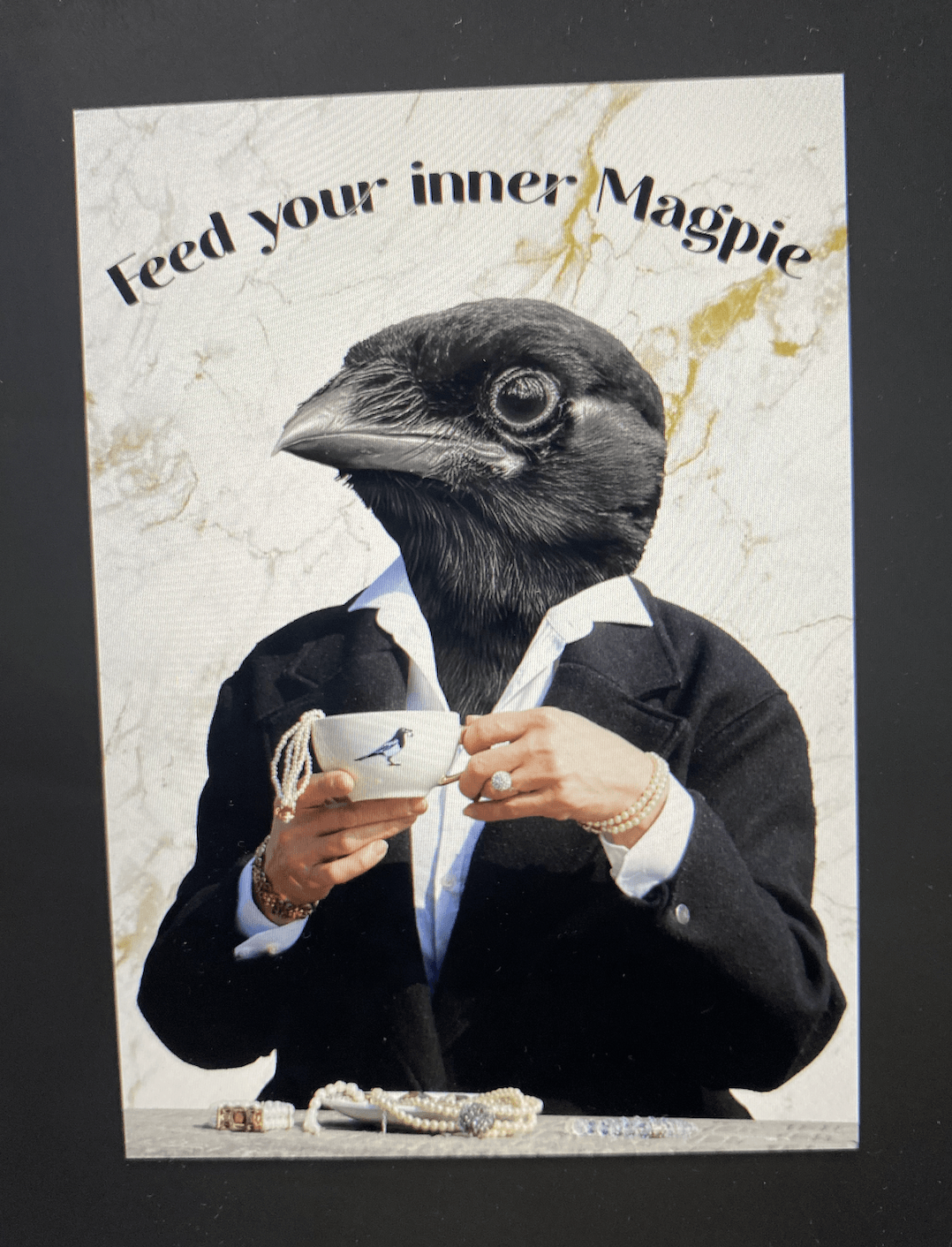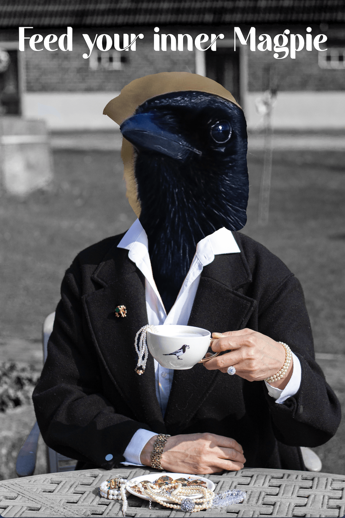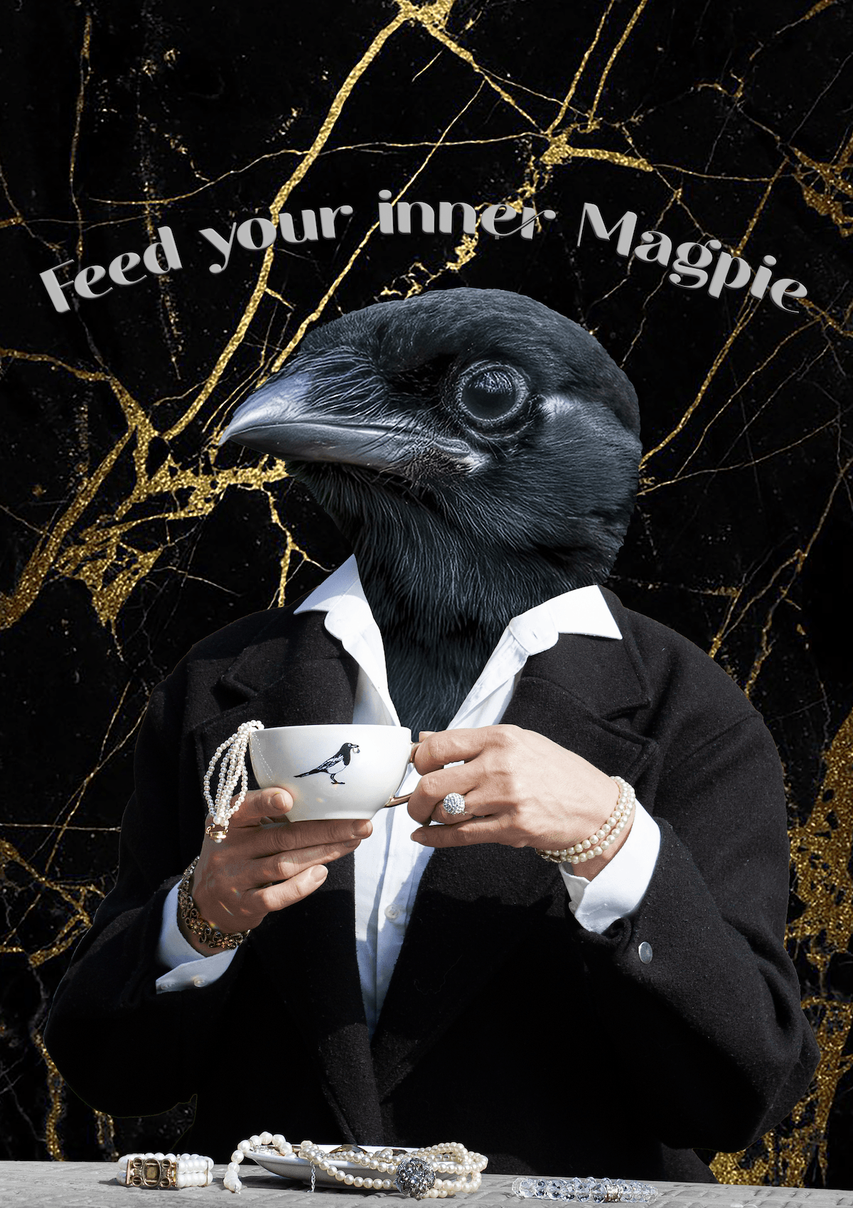 Daarna heb ik het beter toegepast op de stijl van het eksternest door een ekster als hoofd op de mens te gebruiken. Ook heb ik besloten om het kopje die je als verpakking kan kopen in mijn poster te verwerken. Ik heb de tekst 'Feed your inner Magpie' bedacht op basis van 'feed your inner child'. De tekst legt letterlijk een link naar het voeren van een ekster en dus ook het product van een vogelvoer bakje. Daarbij is Magpie in het engels een synoniem voor hoarder, dus een persoon die veel spullen verzameld. Hiermee wil ik overdrijving en bespotten gebruiken om letterlijk te zeggen dat je in de winkel moet komen om nog meer spullen te kopen en te verzamelen.