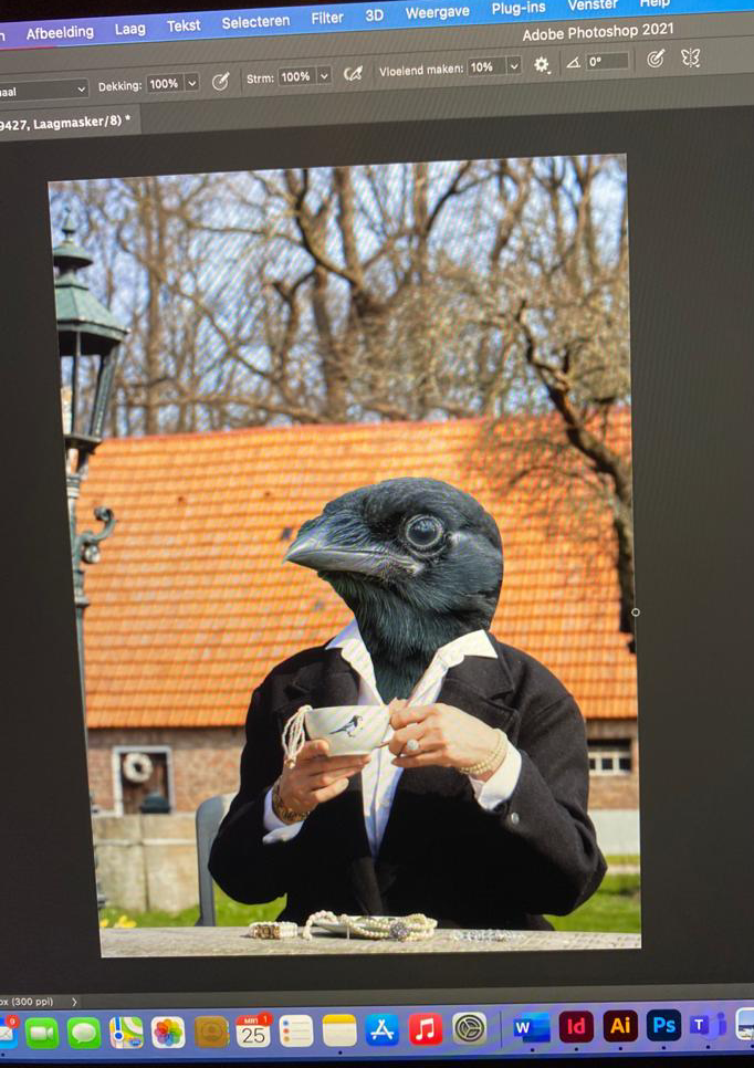 Daarna heb ik een bijpassende ekster gevonden en deze gephotoshopt als hoofd op het lichaam van het model.