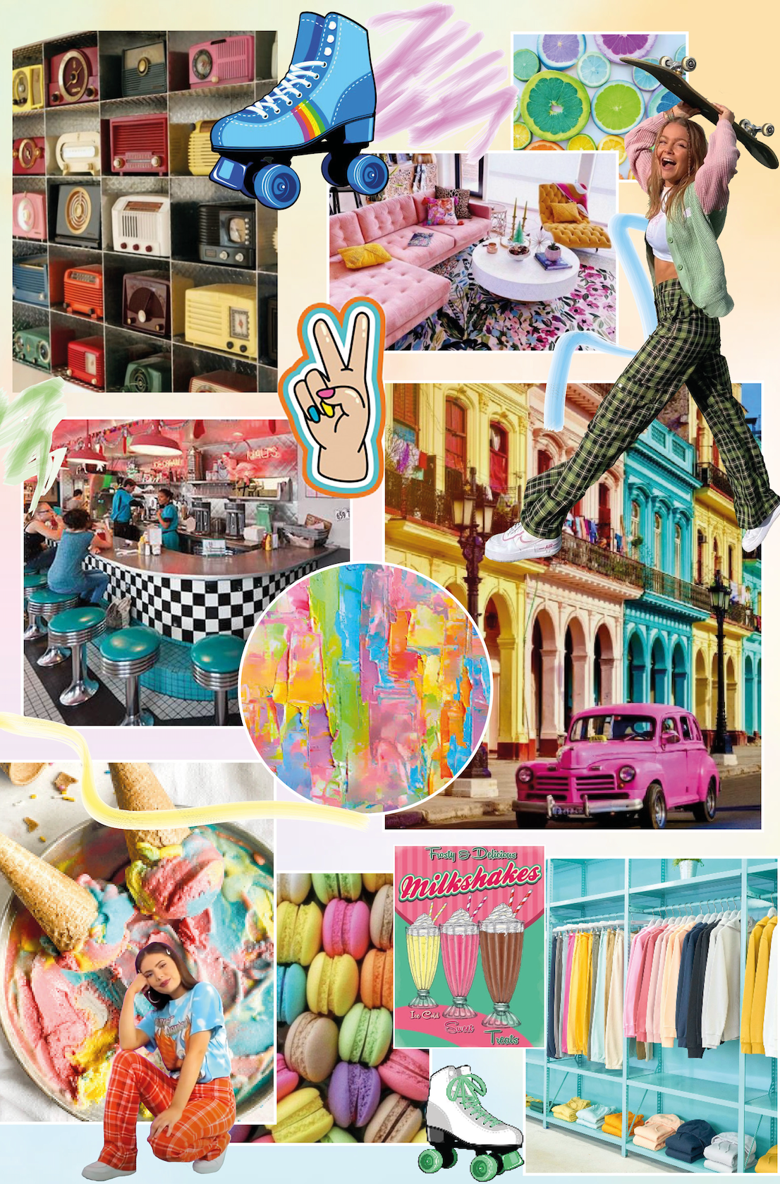 Als ik de winkel zelf zie, dan denk ik meteen aan ouderwets en niet fris. Dit wou ik totaal gaan omkeren naar vrolijk en kleurrijk. Daarbij wou ik er een retro gevoel aan geven door kleurrijke iconische elementen van vroeger toe te voegen. Deze moodboards is daarbij vrij speels. De doelgroep hiervan zijn vooral jonge mensen, zoals e-girls en skaters.