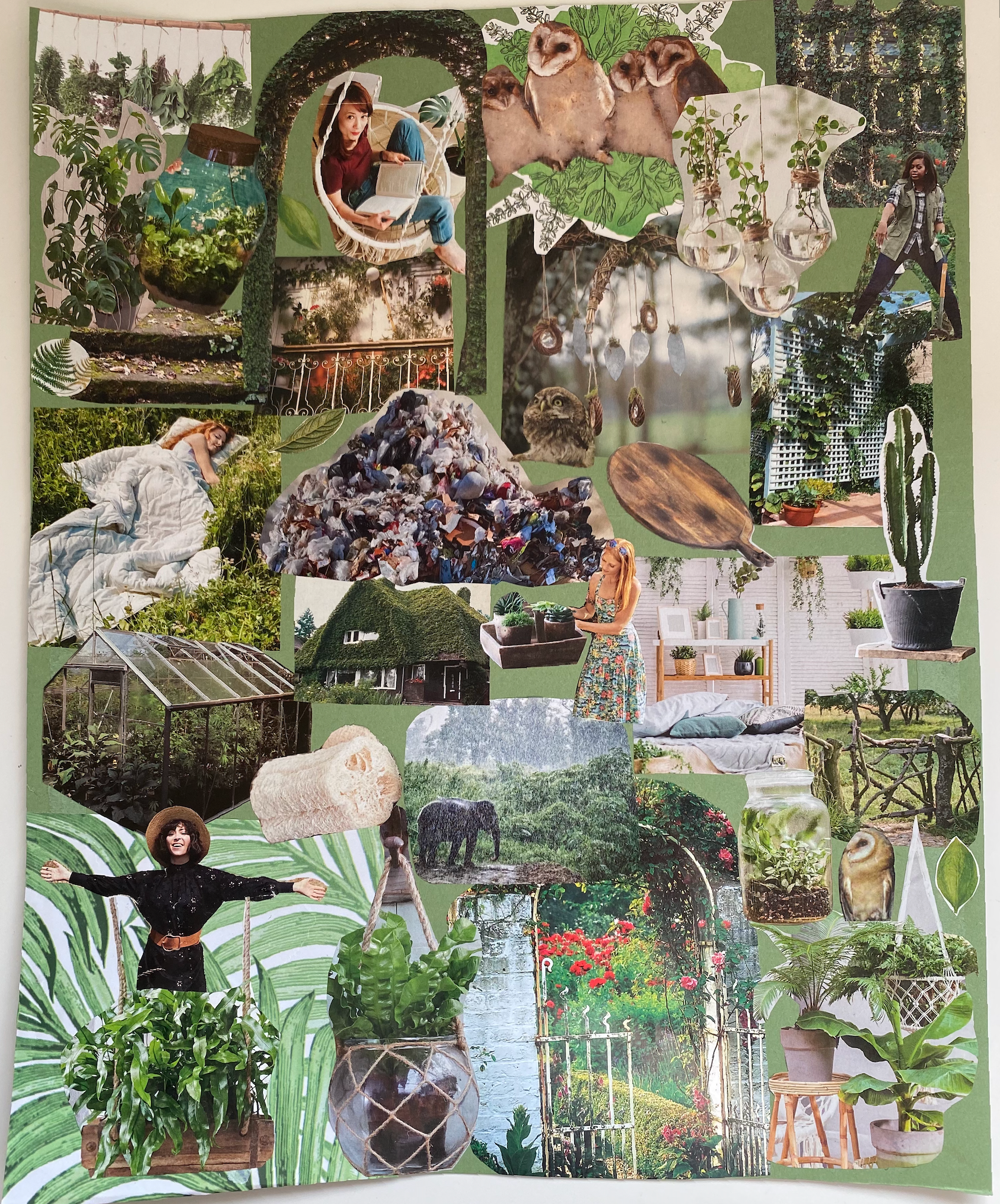 Ik heb gekozen om met deze moodboard vooral duurzaamheid uit te stralen. Veel groen, dichtbij de natuur, achtergelaten en helemaal overgenomen door planten. Later kwam ik op het idee om hier een 'vogelcafé' aan toe te voegen. Waarbij in de winkel allemaal vogels rondvliegen, die waarbij mogelijk kan 'aaien en vasthouden'. Hiermee wil ik het gevoel geven alsof je letterlijk in het bos bent waar vogels rondvliegen. Hiermee kan ik letterlijk het leven in de natuur nabootsen. Met deze thema wil ik graag mensen bewust maken om duurzamer te leven.