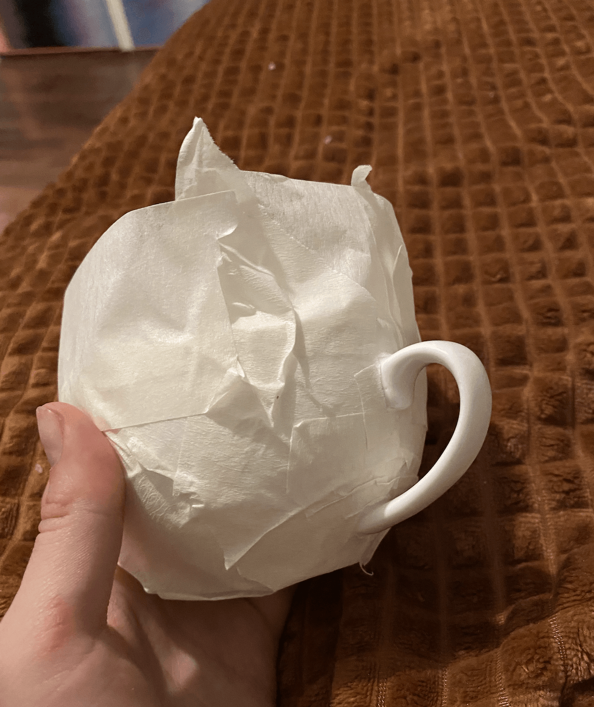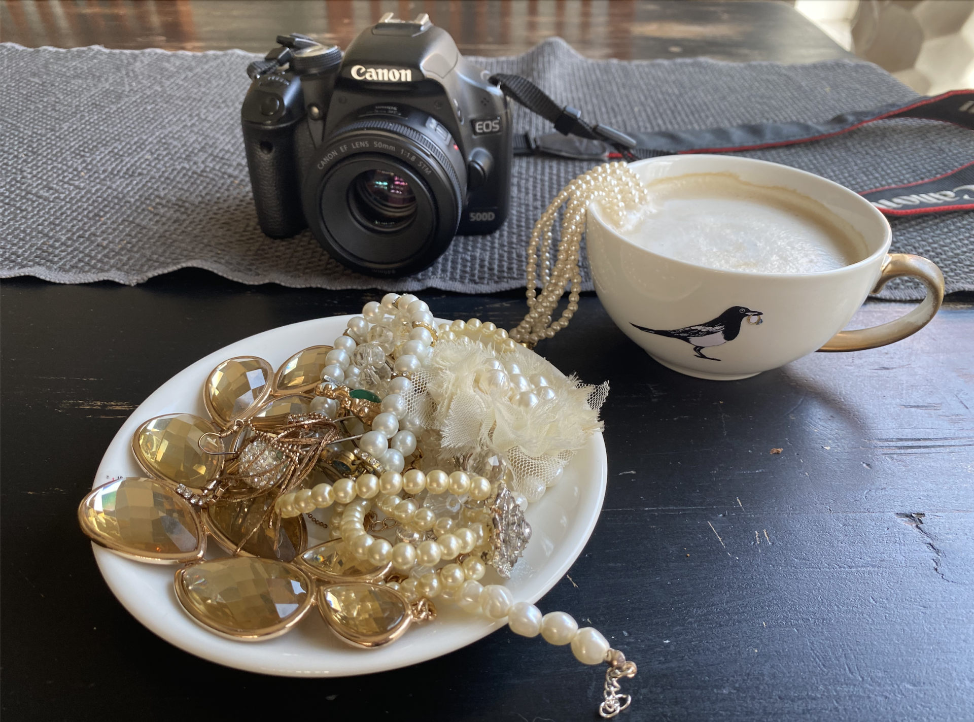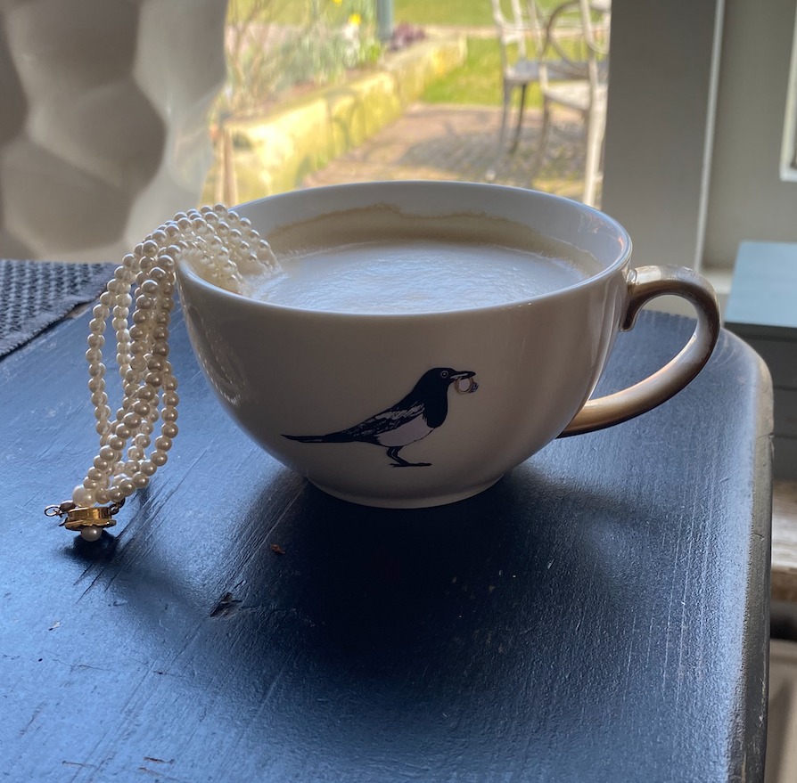 Als eerst heb ik een glimmende parelketting in het koffiekopje gedaan en een cappuccino in gemaakt.