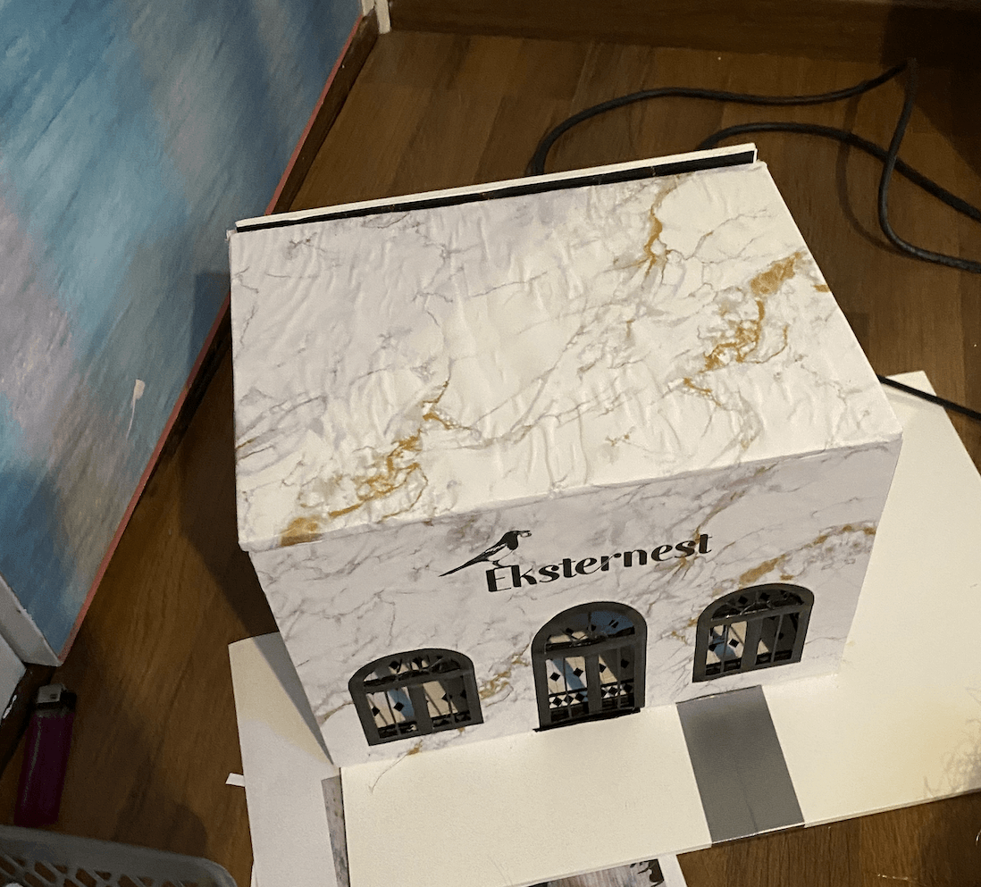 Dit was mijn eerste idee, die ik uiteindelijk heb 'weggegooid' om ideeën voor 'eksternest' te kunnen ontstaan. Bij deze voorkant was het de bedoeling om het helemaal met groene mos en blaadjes te beplakken. Zodat het uit zou zien alsof de natuur het gebouw heeft overgenomen en er vogels in zijn gaan wonen. Ook had ik het idee om binnen touwen op te hangen waar vogels op konden zitten en rondvliegen. Het zou dan een 'vogelcafé' zijn, die vergeleken kan worden met een kattencafé.