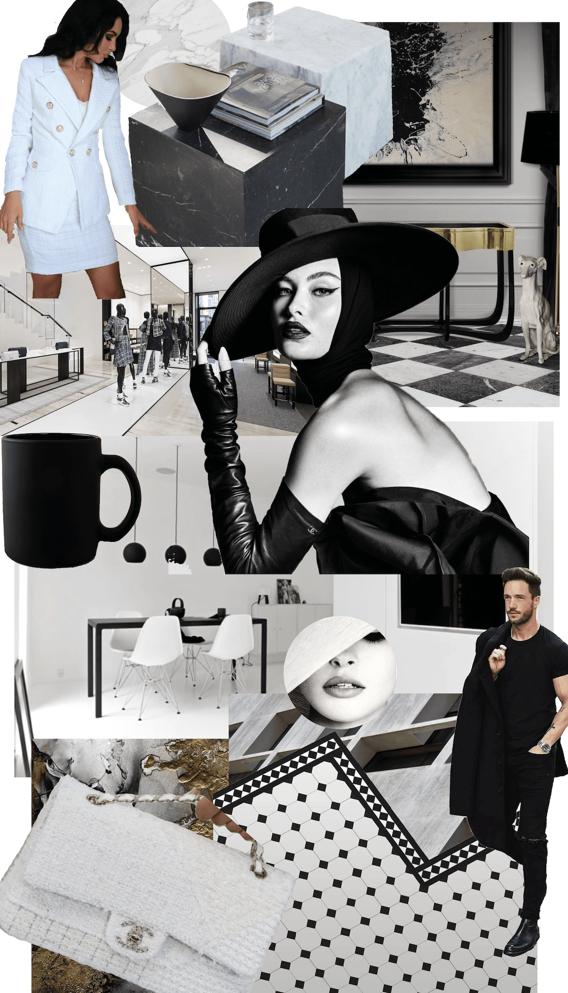 Ik heb er voor gekozen om de tweede moodboard 'op zijn kop te zetten', door de associaties die ik met de kringloop omgekeerd aan te pakken. Een kringloopwinkel is in het algemeen goedkoop, rommelig en beschikbaar voor iedereen. Met deze moodboard wil ik het juist een luxe uitstraling geven. Door het rommelige letterlijke om te draaien, zie ik het juist minimalistisch, strak en vooral zwart&wit voor me.