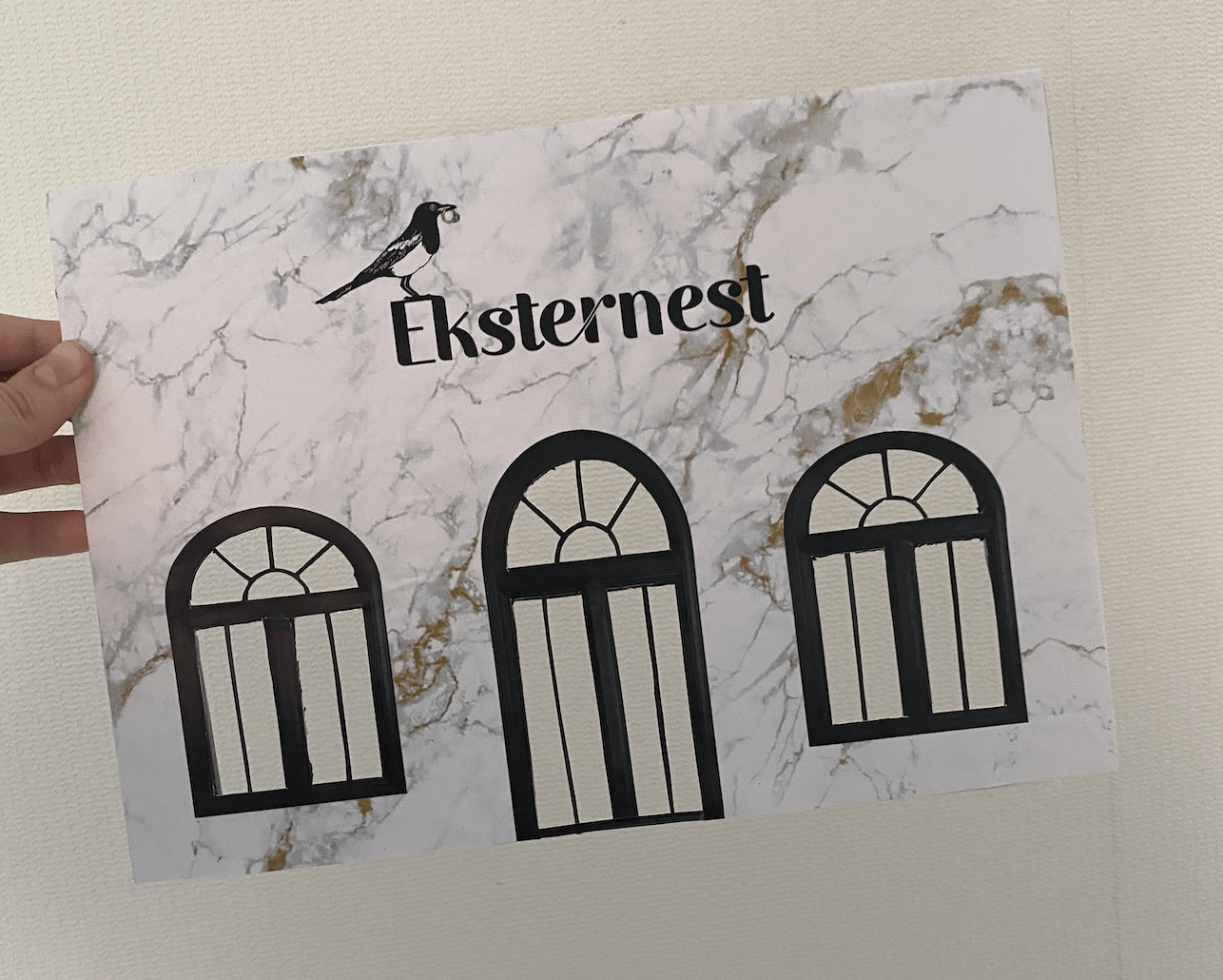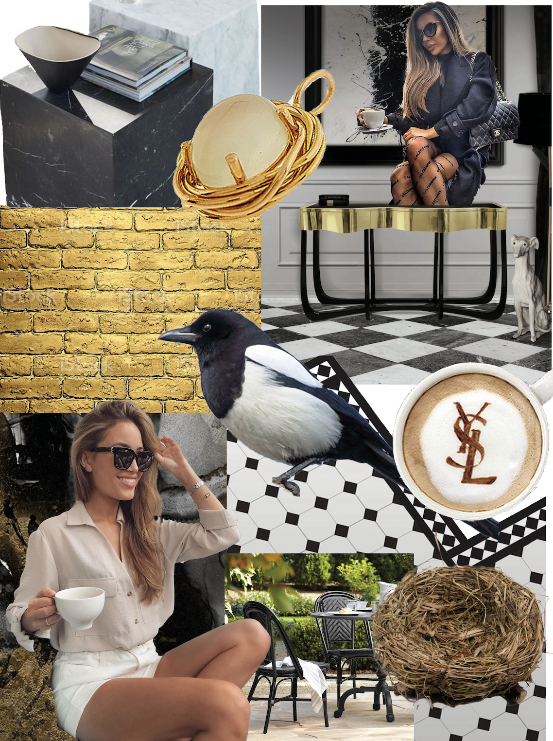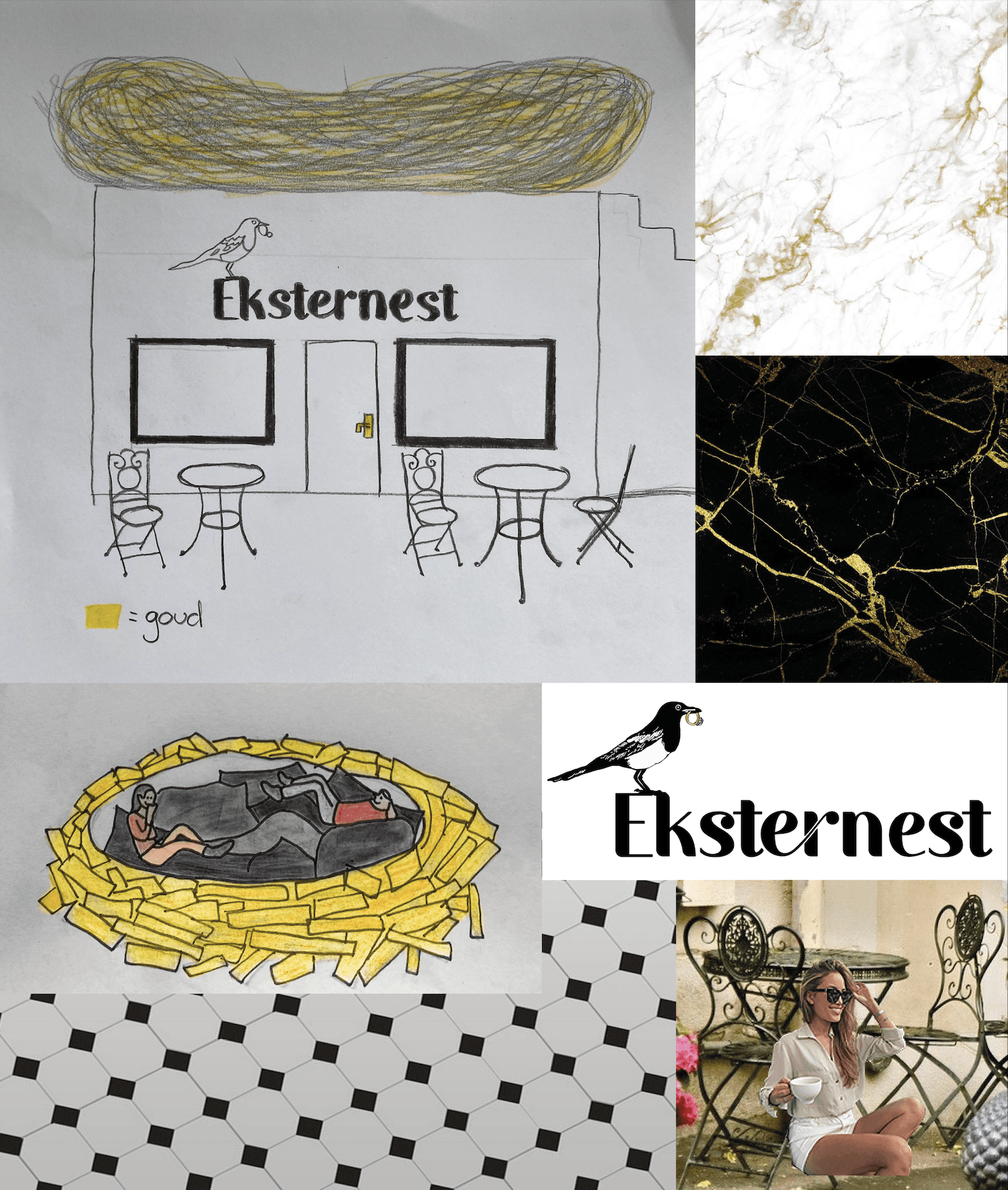 Ik heb gekozen om de twee eerder gemaakte moodboards samen te combineren. Zo heb ik 'minimalistische luxe' met 'duurzaam vanuit vogelperspectief' met elkaar gecombineerd. Hierdoor is het 'eksternest' ontstaan. Dit is een metafoor, voor dat de winkel een 'eksternest' is waar je allemaal tweedehands spullen kan vinden. Deze spullen zouden gestolen door een ekster kunnen zijn.
