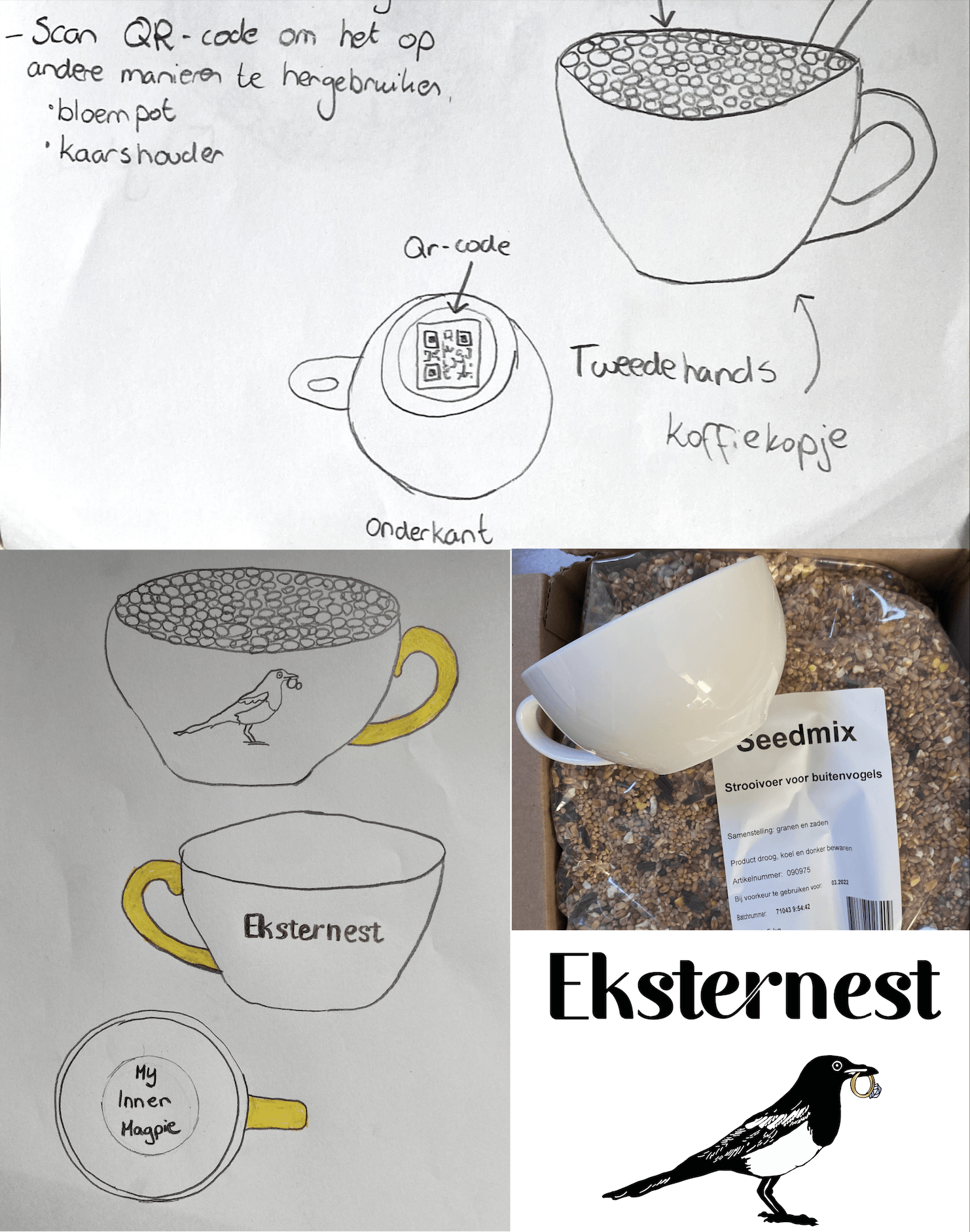 Links is nog het oude design te zien van mijn verpakking. Het idee ervan is hetzelfde gebleven, maar ik heb de buitenkant helemaal veranderd om het passend bij de stijl van 'eksternest' te maken, deze is rechts te zien. Het idee ervan is dat tweedehands koffiekopjes hergebruikt worden voor verpakking. Deze zijn als koffiekopje zelf te koop, maar je kan ze ook kopen als vogelvoer bakjes. Hiermee wou ik een link leggen naar een ekster die je letterlijk zelf kan gaan voeren. Als de vogelvoer op is, dan kun je de verpakking op 4 manieren hergebruiken. Onderop het kopje zit een QR-code die je kan scannen, dan kom je op de pagina waar deze 4 manieren stap voor stap zijn uitgewerkt. Hiermee kun je de verpakking levenslang gebruiken op allemaal verschillende manieren. Zo kun je er een bloempot van maken, een kandelaar, cadeauverpakking of weer gebruiken als voerbakje voor de vogels. Klik hier om op de pagina van de QR-code te komen.