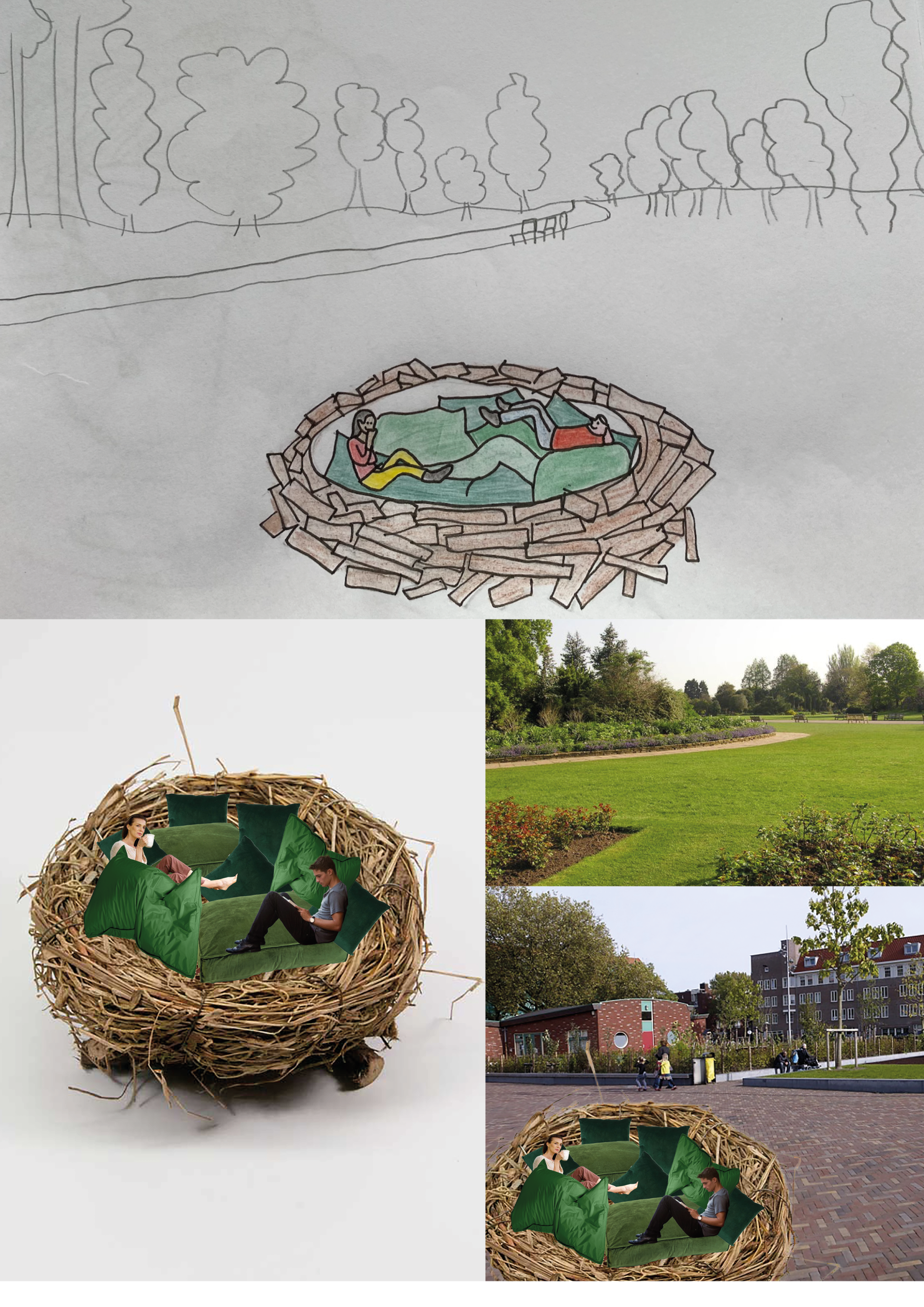 Mijn tweede bedachte guerrillamarketing is een gigantische nest met kussens waar mensen in kunnen zitten of liggen. Eerst had ik het idee om deze nest in een park te plaatsen met een logo van de winkel er op. Later besloot ik om het nest op het dak te plaatsen en hiervan een dakterras te maken. Hierbij heb ik de methode van overdrijving en vergelijking gebruikt.