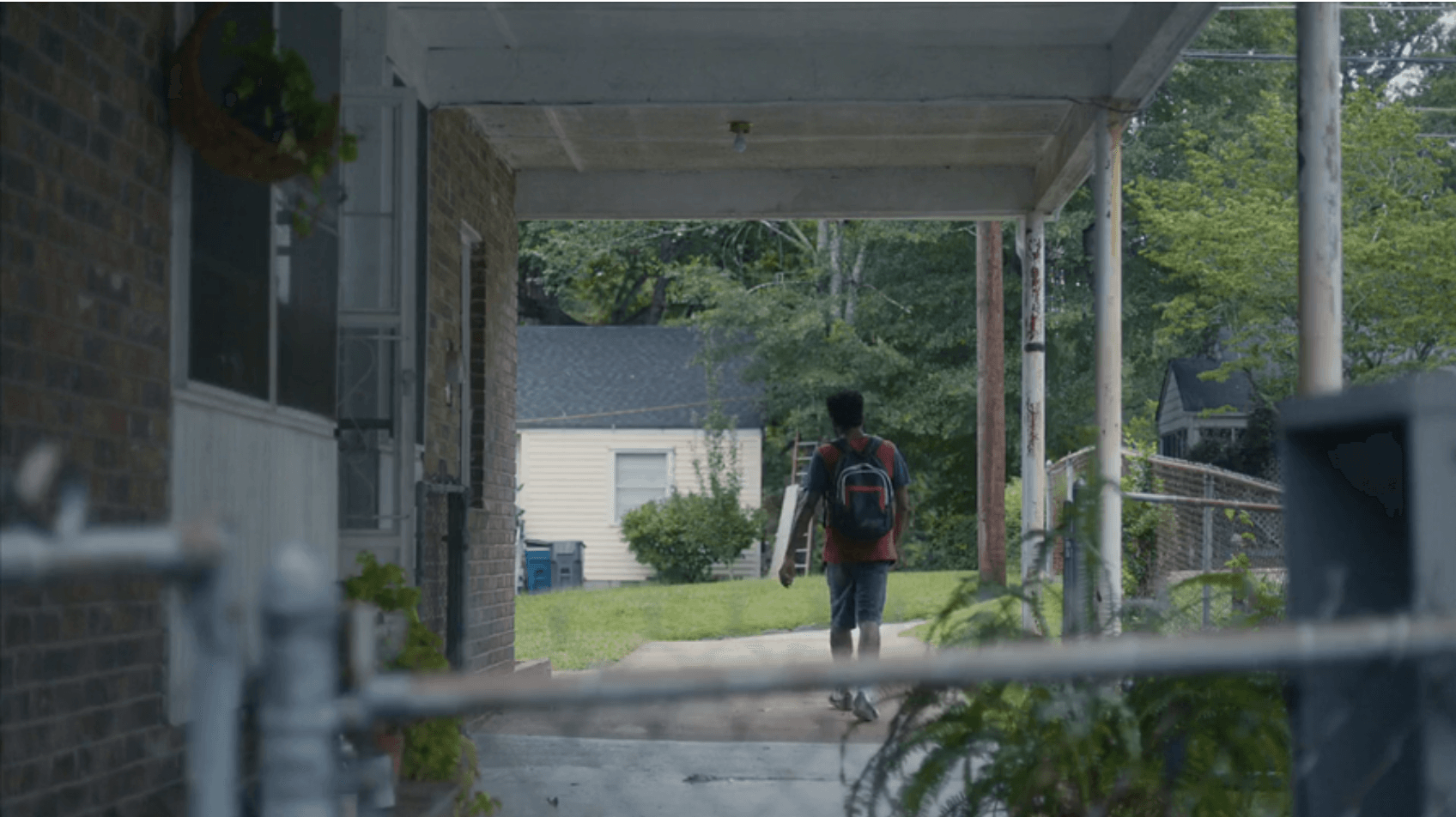 - In de eerste shot staat Earn buiten, achter een gesloten deur. Als kijker zien we hem door de deur heen, waardoor hij in een soort frame staat. Hierdoor heb je als kijker het gevoel dat je hem buitensluit en aan de overkant staat, in de positie van zijn ouders. De tweede shot is na de eerste shot te zien, op dat moment loopt Earn weg van het huis van zijn ouders. Er staat een hek voor de camera waardoor we Earn eigenlijk nog steeds niet kunnen zien en dit weer buitensluiten of opsluiten kan symboliseren. Er is een grote afstand tussen de kijker en Earn, de camera volgt hem niet maar blijft op afstand. In beide shots zien we interne focalisatie, als kijkers weten we net zo veel als Earn. Daarbij kunnen we door het camerastandpunt inleven wat hij op dat moment voelt, namelijk buitengesloten. Maar er is wel sprake van objective depth, aangezien we niet horen of weten wat er in het hoofd van Earn afspeelt. We weten niet wat hij op dat moment denkt, maar zien wel wat er gebeurt.